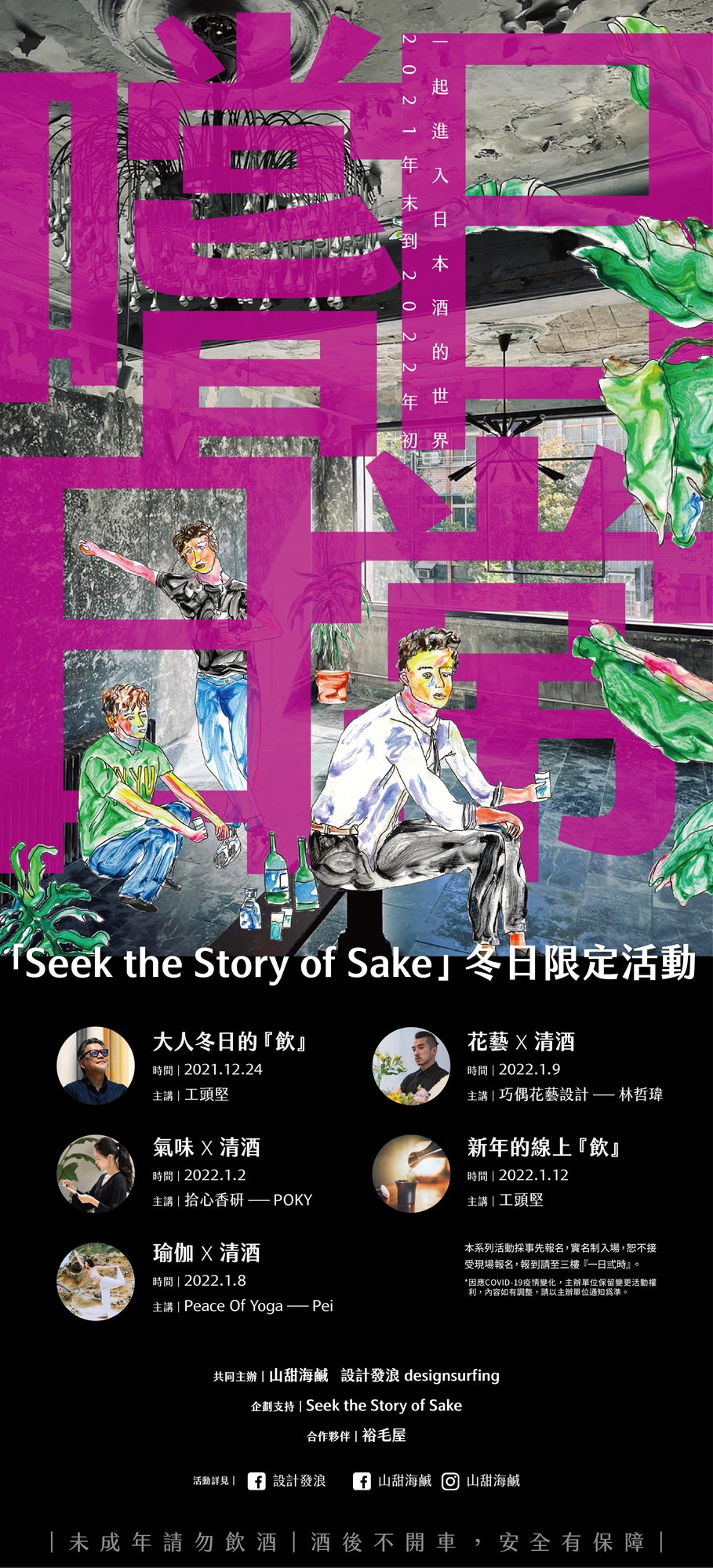 為了讓鍾情日本的愛好者們更加了解關於「清酒」的二三事,由 山甜海鹹 及 設計發浪 攜手日本酒跨境電商網站 Seek the Story of Sake ,策劃了『嚐日 ‧ 日常』主題系列活動。活動中將介紹的不鏽鋼德利酒瓶,是由大正時代營業至今的金屬工藝百年老舖「Sasage工業有限公司」特別製作,值得典藏。該公司座落於全球知名的金屬工藝加工都市—新潟縣燕三條,與在日本國內相當知名,歷史悠久的出羽櫻酒造株式會社(山形縣)、株式會社増田徳兵衛商店(京都府)、吉乃川株式會社(新潟縣)分別販售數量及季節限定的日本酒,藉著使用鋁罐裝瓶,得以輕量化且承受強力衝擊,也可達到節能減碳、減化包裝的效果。我們都會在這次『嚐日 ‧ 日常』系列工作坊中一一介紹給大家,藉由氣味、瑜伽與花藝體驗,同時試飲三支只有在日本地方才能喝到的大吟釀地酒,讓身在台灣的日本酒愛好者們即便不出國門,也能夠讓日本酒跟我們的五感連結,品嚐到日本地方酒造的誠心榮譽之作。