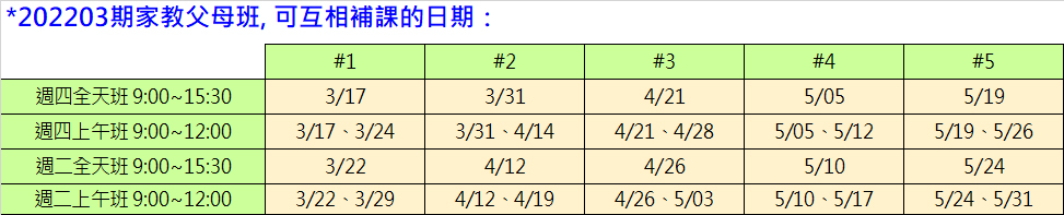 ※若臨時有事須請假, 可到同進度的另一班補課。例如:#1的3/17與3/22進度相同可互相補課,3/24上午與3/17下午的進度相同可互相補課。