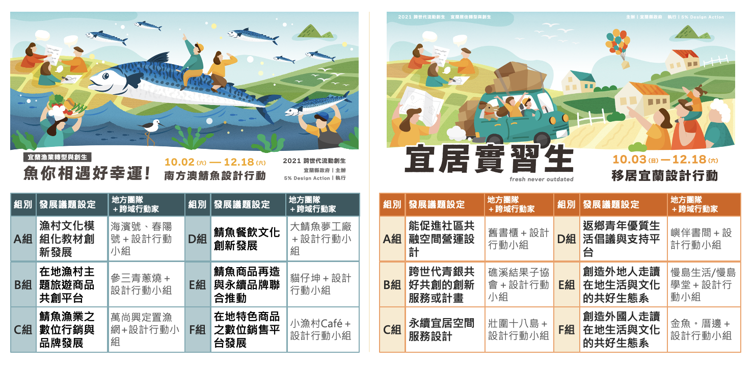 近年來台灣各地興起地方創生社會創新運動,政府與民間紛紛發起多元計畫推動地方創生,興起一波青年人口留鄉與返鄉的風潮,期待為地方帶來許多經濟與文化的發展。宜蘭縣政府借重開放式創新機制,由青年事務科與5% Design Action社計行動平台聯手推出「跨世代流動創生」,建構「地方出題,線上解題」的地方創生方程式,以兩大主軸「南方澳鯖魚地方資產」與「移居宜蘭・宜蘭宜居」為出題,共招募12個具代表性地方代表團隊,70多位來自台灣不同地區的跨專業設計行動家、超過30位議題專家,籌組「線上設計小組」,歷時三個月以「線上加線下」接力方式進行合作,為12個不同議題發展創新解方。