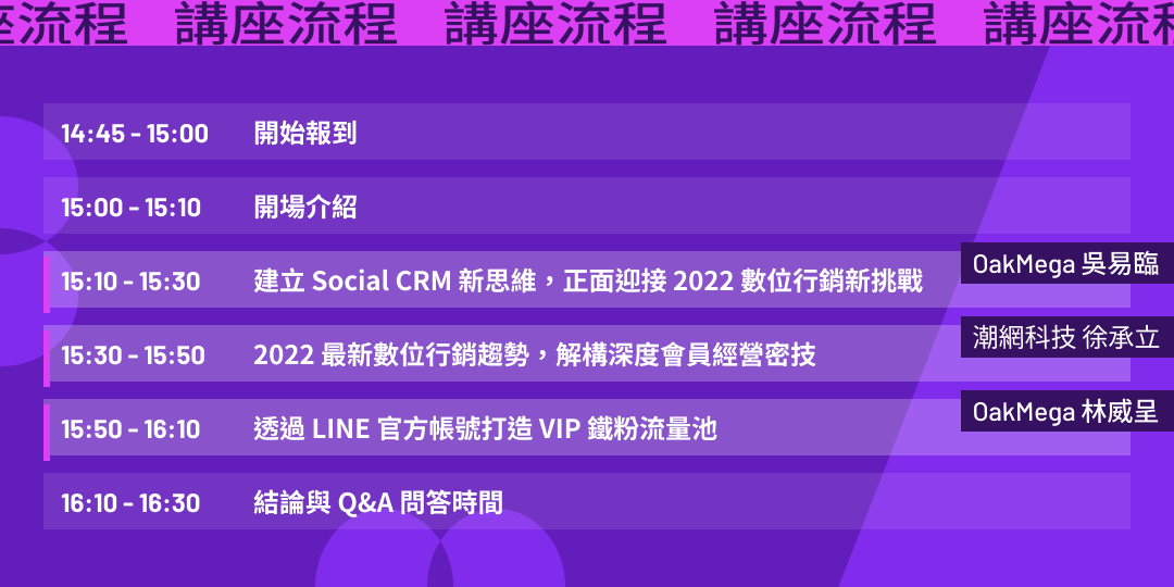 本次講座邀請到 OakMega 行銷經理 吳易臨、資深業務執行 林威呈 與大家分享 2022 顧客互動新趨勢,以及 LINE 官方帳號的經營策略:「如何透過 Social CRM 串連後台數據資料,在 LINE 官方帳號一站式完成獲客・銷售・客服流程,掌握每一次的銷售機會,提升訂單轉換率」。另外邀請潮網科技的整合行銷部副總 徐承立 分享 2022 最新解構深度會員經營密技。