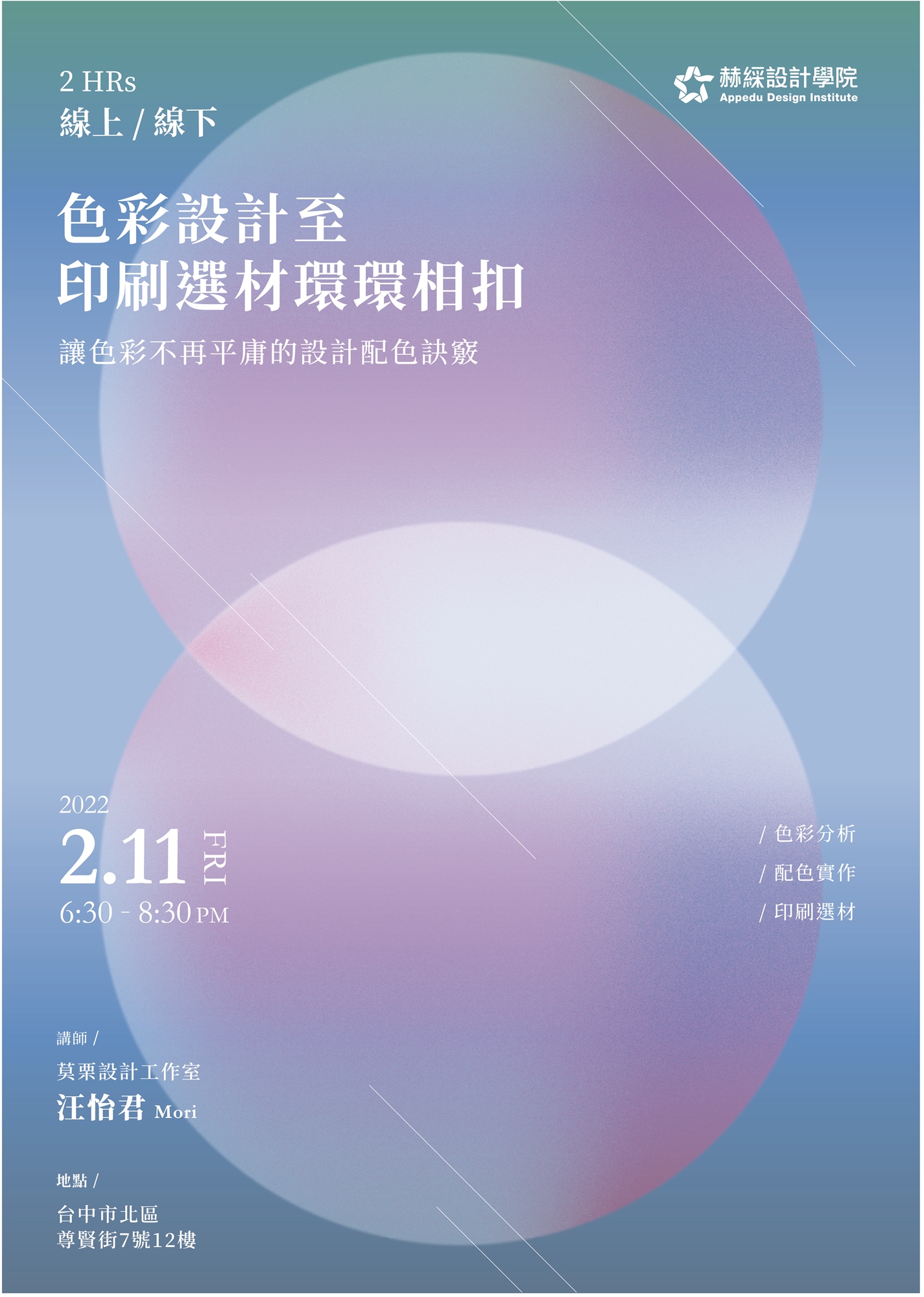 此次講堂將現場進行配色實作,濃縮最精闢色彩運用技巧
