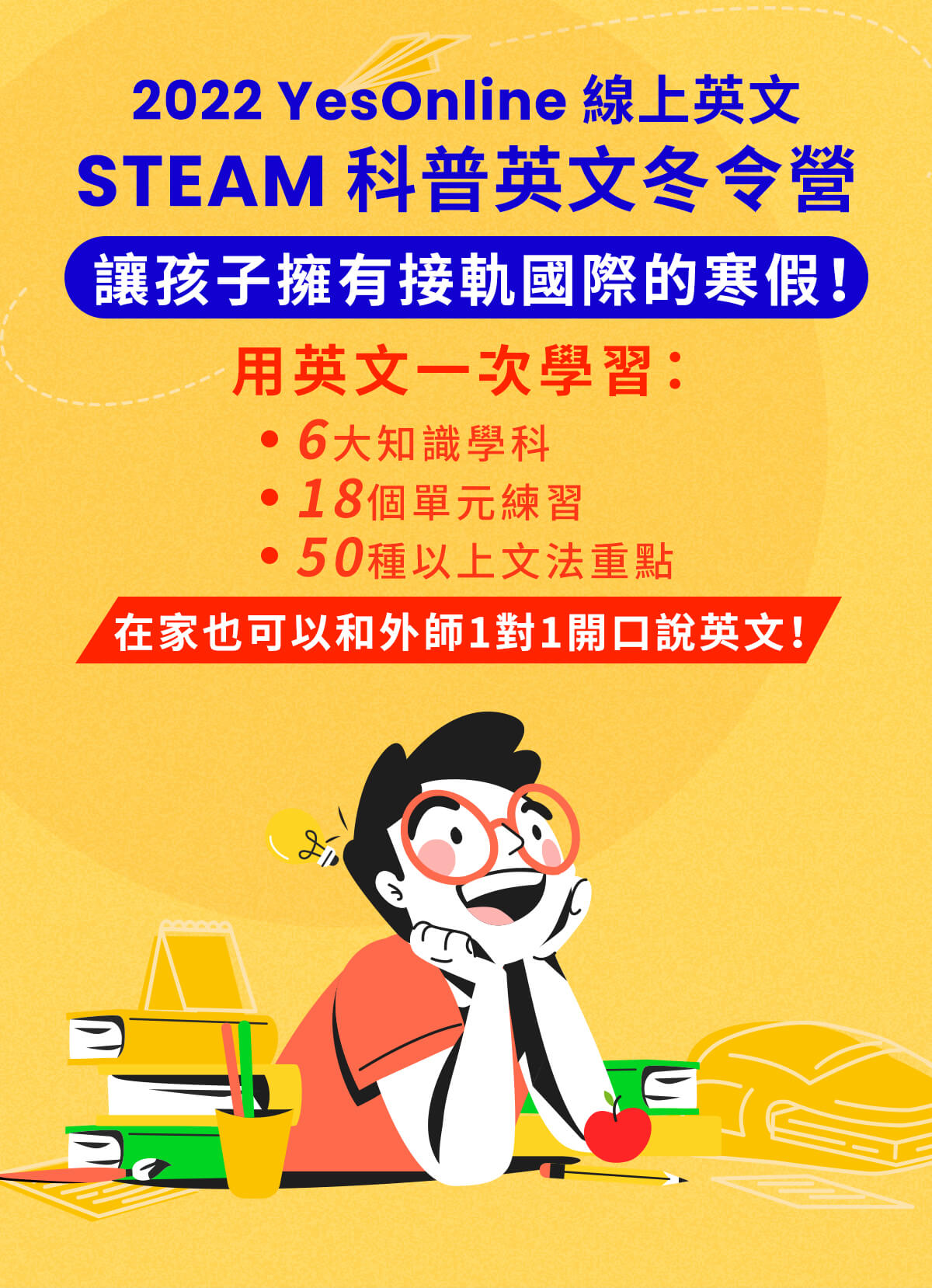 今年寒假,YesOnline特開設線上科普英文STEAM冬令營,教孩子在家也能在線上學習實用英文知識,一次獲得6大學科/18個單元練習/50種以上文法重點,讓孩子有個歡樂與收穫滿滿的寒假!