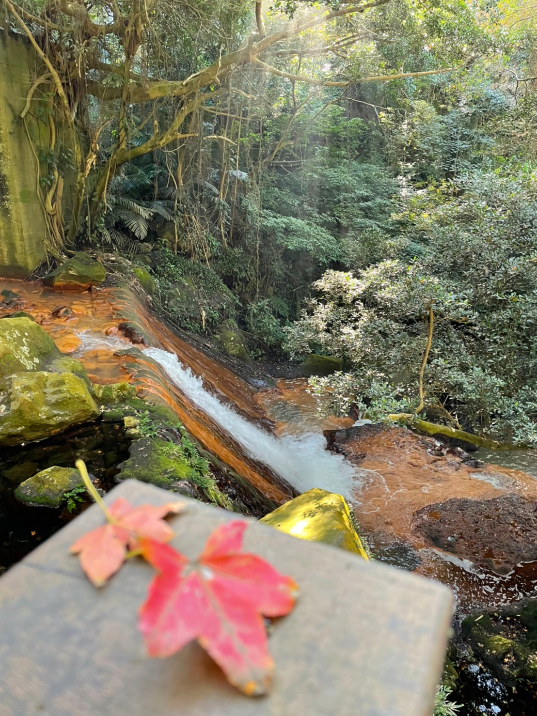 配上同樣被染成金黃色的溪流岩石,以及兩旁茂密的山谷植被