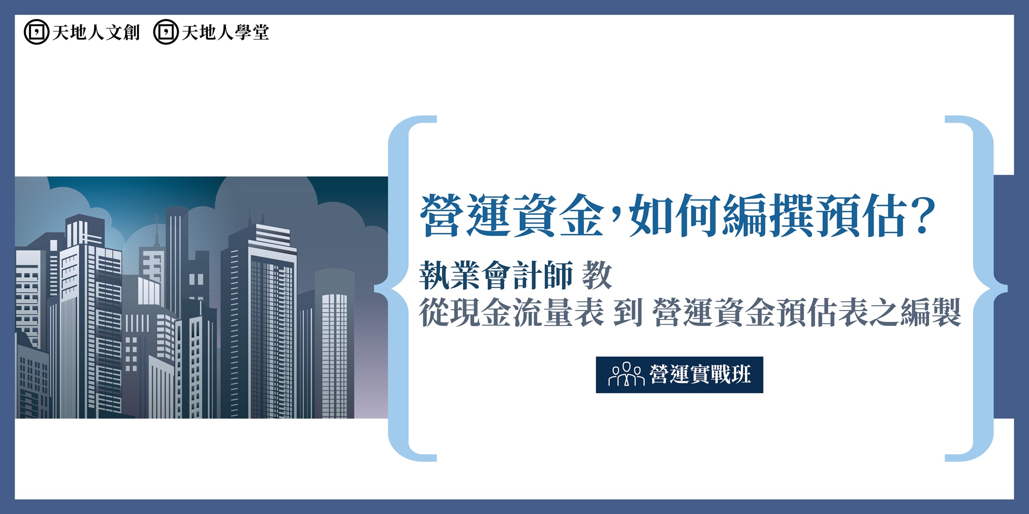 做好「營運資金預估表」可以避免公司資金周轉不靈的問題,精準掌控企業資金動向。有鑑於此,天地人文創旗下天地人學堂特地規劃出「營運資金,如何編撰預估?執業會計師教從看懂現金流量表到營運資金預估表之編製|營運實戰班」,邀請到現任敬興聯合會計師事務所執業會計師親授課程,以多年扎實的實務經驗由淺入深的帶領學員全面拆解動態簡報的製作流程與工具應用的六大核心技能:(1)影響現金流的因素;(2)判讀現金流量表;(3)現金流動的關鍵:營業循環;(4)營運資金預估表之編製;(5)國內外知名企業現金流量表解析,透過這門課程,協助你瞭解企業經營的現金流與營運資金預估表的實戰操作技巧與Know-how。