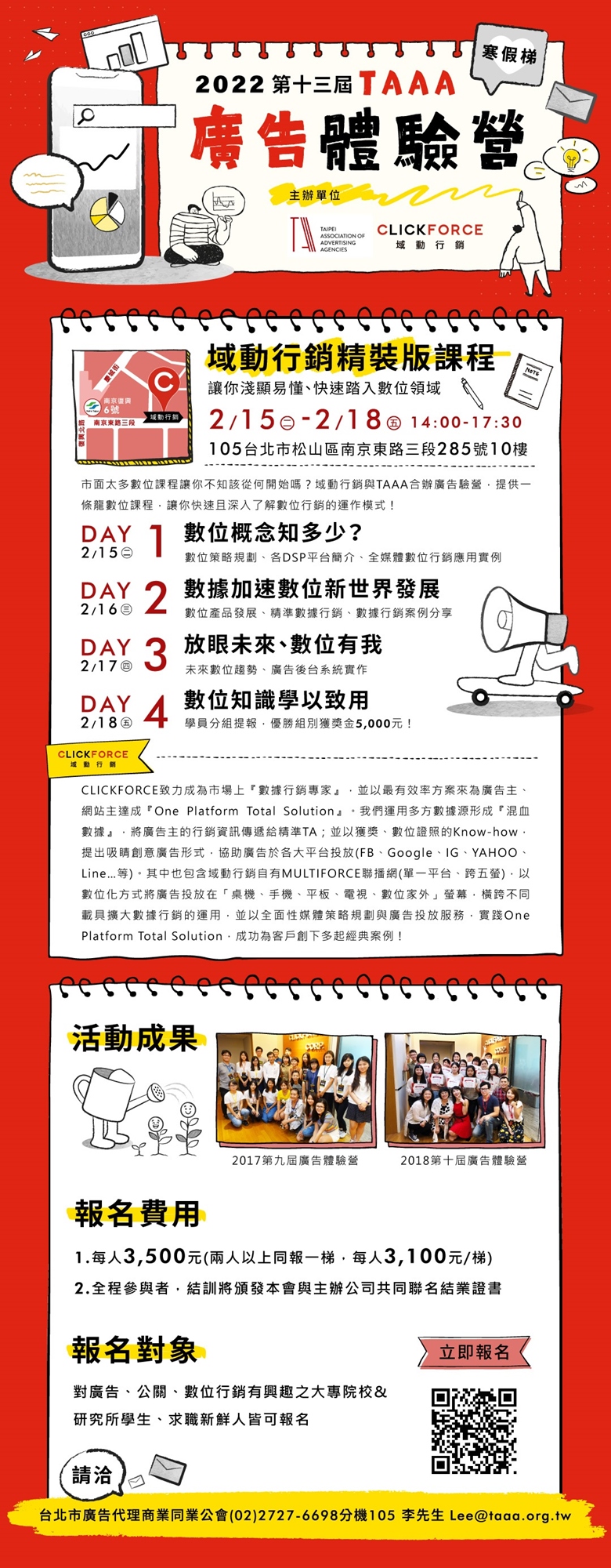 最新消息:廣告公會寒假廣告體驗營決議延期舉行,視疫情狀況確認日期後將再另行通知。敬請各位同學關注最新活動時間,造成困擾敬請見諒,謝謝!