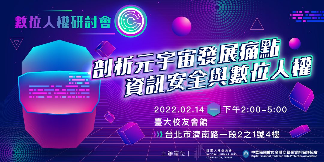 為推廣數位人權觀念,國家人權委員會與中華民國數位金融交易暨資料保護協會將共同舉辦四場《數位人權研討會》,邀請各界學者及實務工作者分享多元跨領域觀點,結合各方專業知識及實際經驗,共同探討在高度數位化的時代,如何藉由科技面對多元變化形態、數位未來之際。