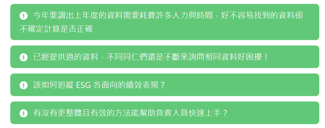 ESG 分別代表「 環境、社會與公司治理 」三個面向,是一套衡量企業永續性的指標,強調企業應將環境、社會和公司治理等因素納入投資決策或者企業經營之考量,當企業開始重視永續發展的策略後,對於企業內部在收集ESG相關數據時常有以下困擾: