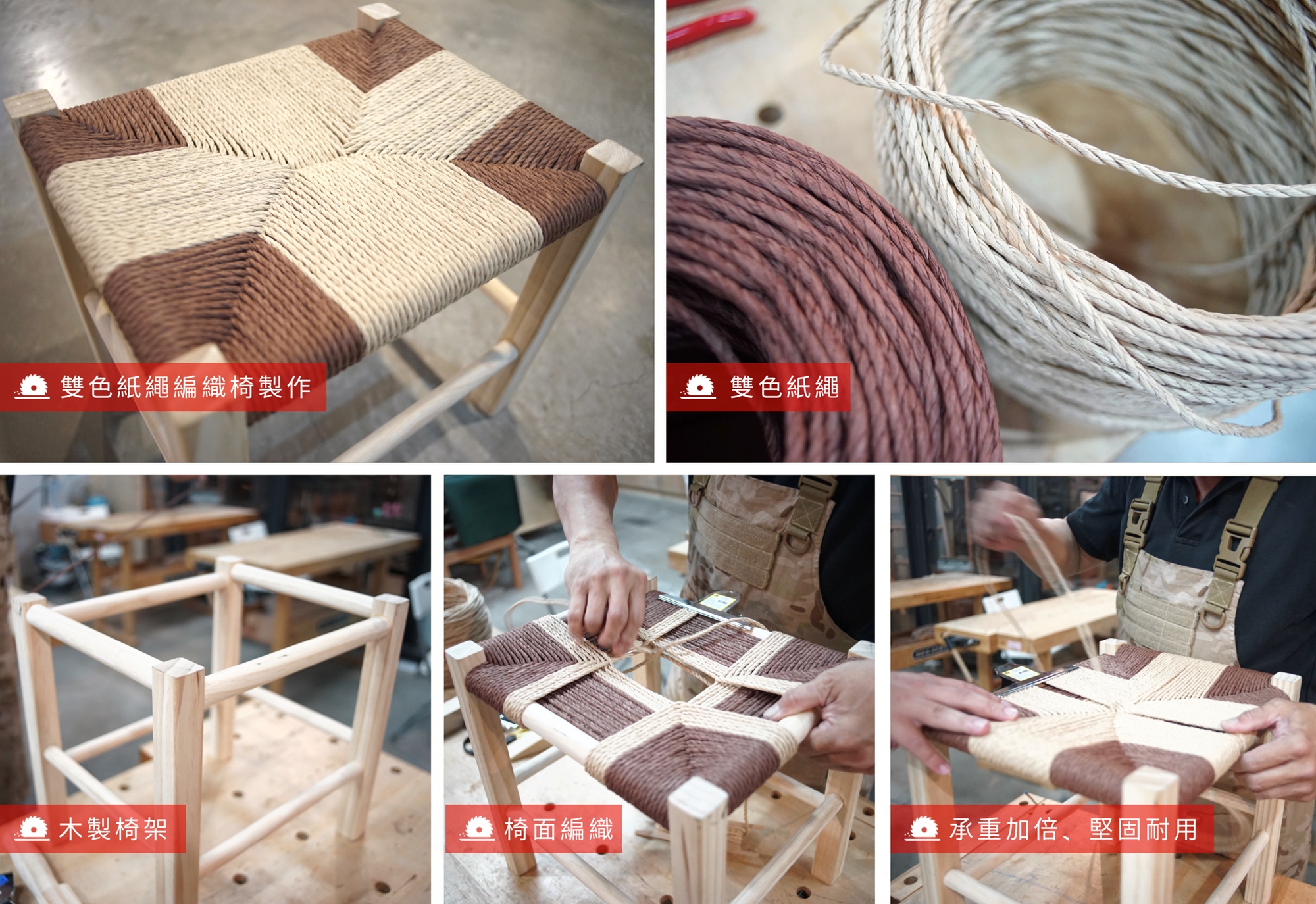 課程將幫您完成最辛勞的木製椅架部分,直接帶您運用兩色紙繩,一步步完成椅面編織。讓您盡情發揮編織功力,製作出兼具美觀與耐用的工藝品!