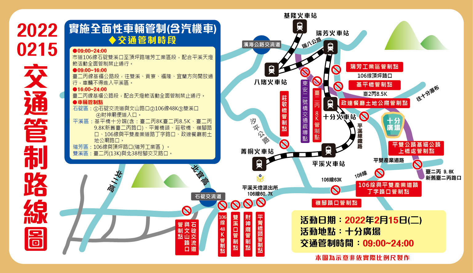 ◎管制日期:111 年 2 月 12日、2 月 15 日實施全面性車輛管制(含機踏車)
