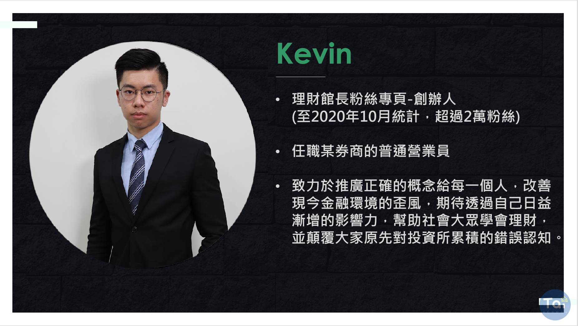 講者 Kevin 擅長以清晰易懂的方式,說明複雜的概念,目前為知名證券營業員,更是粉絲數破萬人的理財館長創辦人!本課程不會有艱深的名詞,帶領你顛覆原本主動投資的思維,跳脫金融業利益的框架!