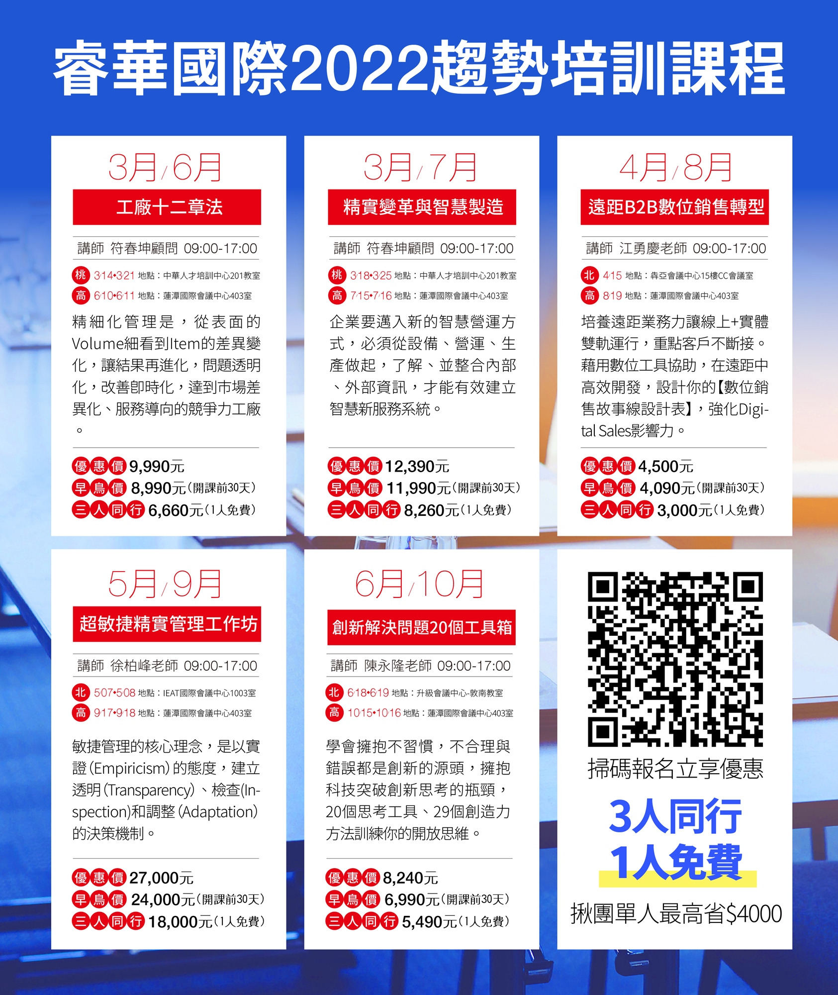 睿華國際2022將從「生產製造管理」、「業務開發銷售」與「組織跨部門合作」三大構面,