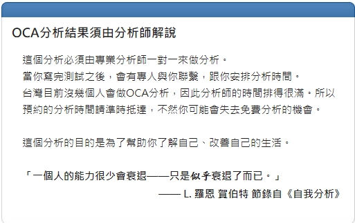 在完成牛津能力分析的面談之後, 我擁有更多思考的彈性以及行動的動力,也更能夠做決定, 我很開心, 真的非常感謝介紹我前來的朋友以及分析師!