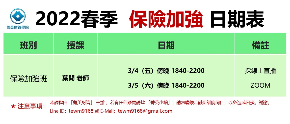 | 保險加強班 | 3/4 (五) 18:40 - 22:00 |