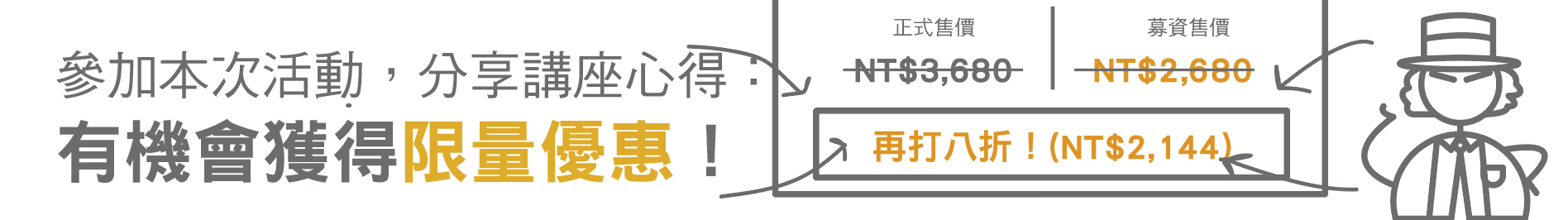 本次的活動,除了將保留時間給予各位參與者進行線上QA以外,在7/11活動結束後,也會鼓勵大家分享本次分享之心得。Page將根據分享內容最佳的三篇心得,送出《五階段提案誘導術》課程的八折券,讓你能享有比早鳥預購價更便宜的價格!