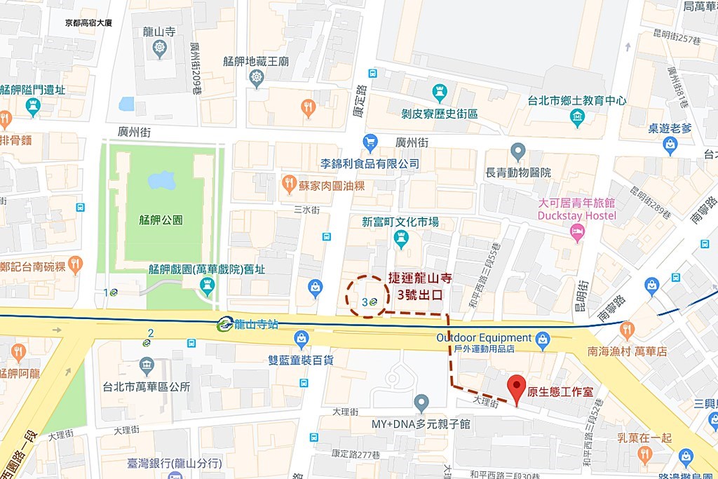坐落在北萬華的文創區域,捷運龍山寺站三號出口,步行3分鐘即可抵達原生態工作室