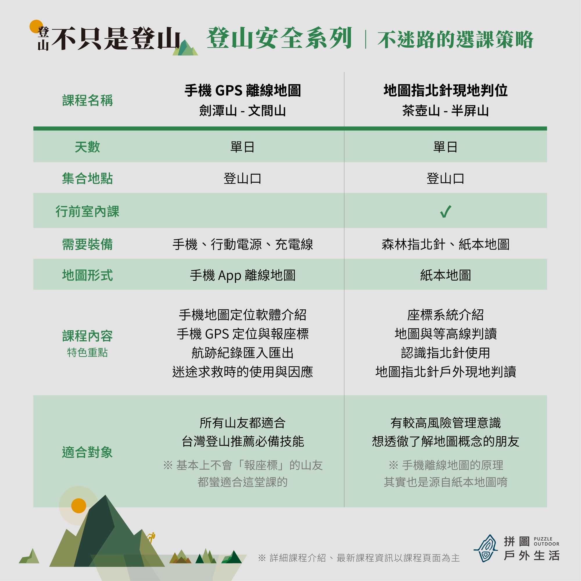課程相關疑問,歡迎私訊拼圖戶外FB向小編諮詢,這是最快的方法。也歡迎來信拼圖信箱puzzleoutdoor@gmail.com,我們會依照進件先後順序,處理大家的疑問,請耐心等候唷