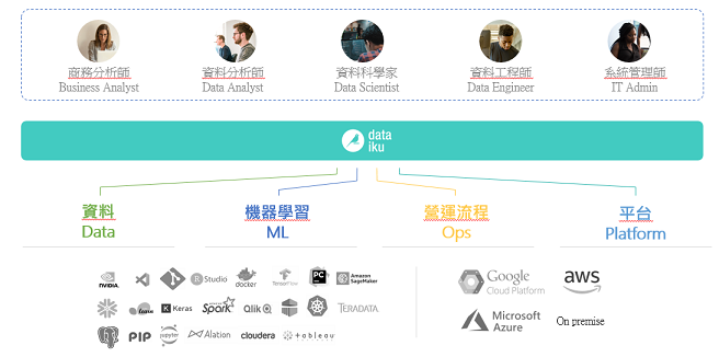 Dataiku DSS(Data Science Studio)—透過流暢的價值鍊設計及可視化介面,讓AI團隊中的各式人材,都能有效率地協同合作,省時省力地達成業務目標,加速組織內AI應用發展、提升AI素養及培育專業人材。