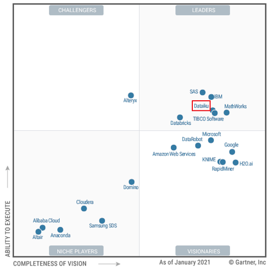 Dataiku DSS(Data Science Studio) 被《Gartner 2021年數據科學和機器學習平台魔力象限》報告評為領導者,該公司連續兩年入圍領導者象限,為全球400多家公司提供人工智能戰略,歐美百大企業主流機器學習協作平台!