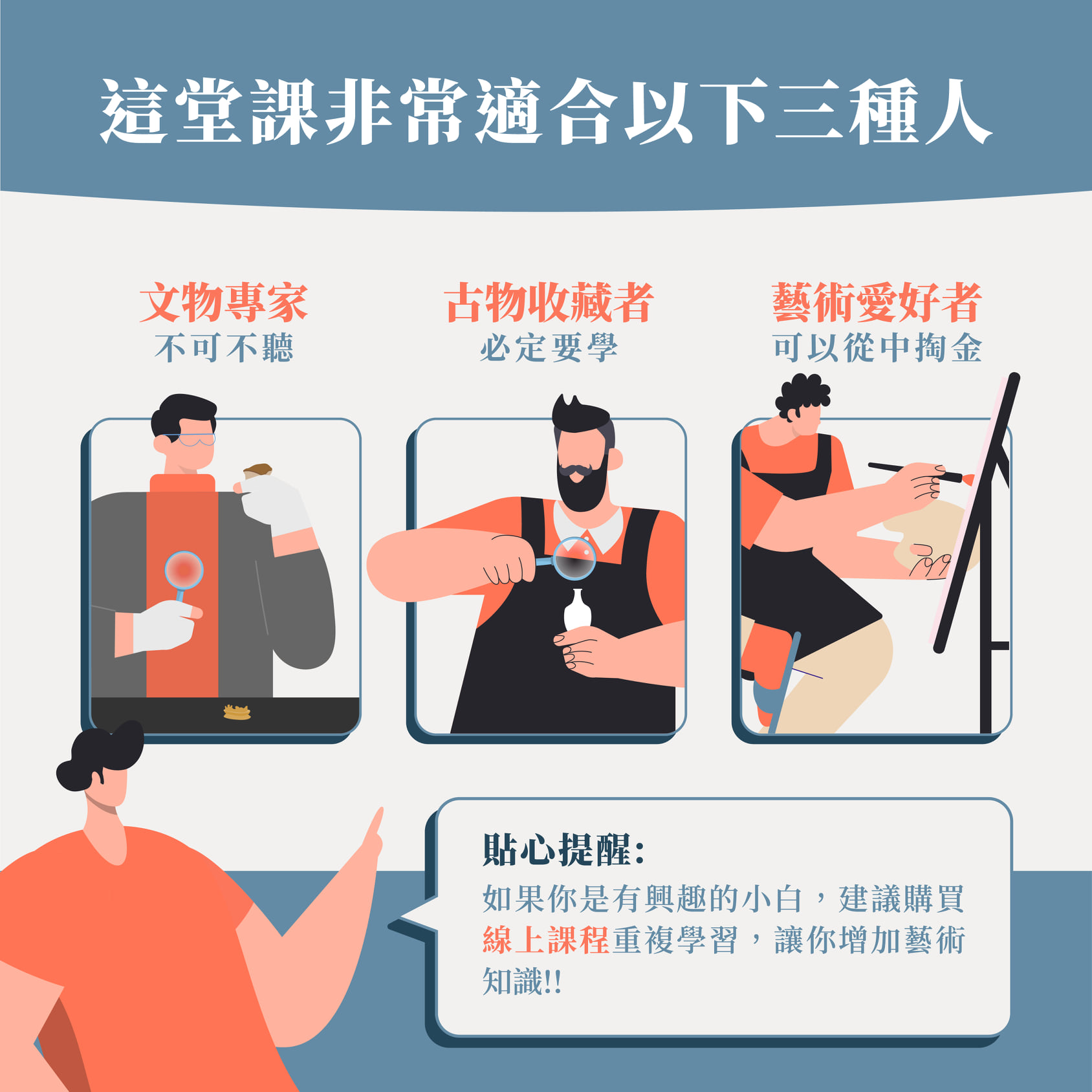 藝術史背景、文物專家、古物收藏者、藝術愛好者。