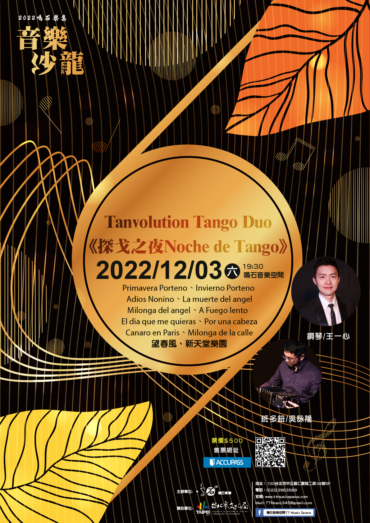 從黃金探戈期到皮亞佐拉的的新探戈時代,阿根廷探戈音樂充滿醉心迷人的氛圍,國內首個受邀至阿根廷演出之探戈樂團Tanvolution將帶來二重奏編制---班多鈕家吳詠隆與鋼琴家王一心攜手演出皮亞佐拉經典作品,也將帶來創作曲目,一起與聽眾感受皮亞佐拉音樂裡的熱情與傷感!
