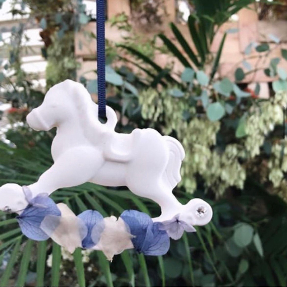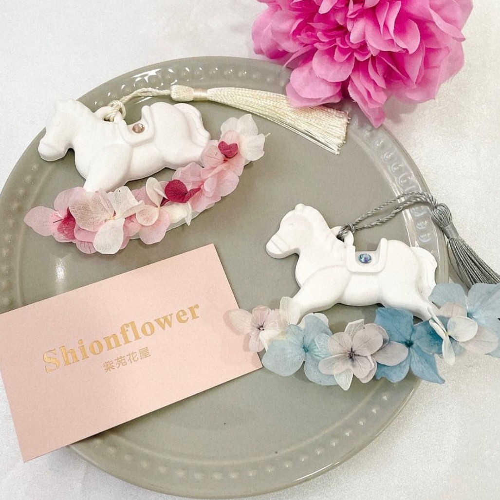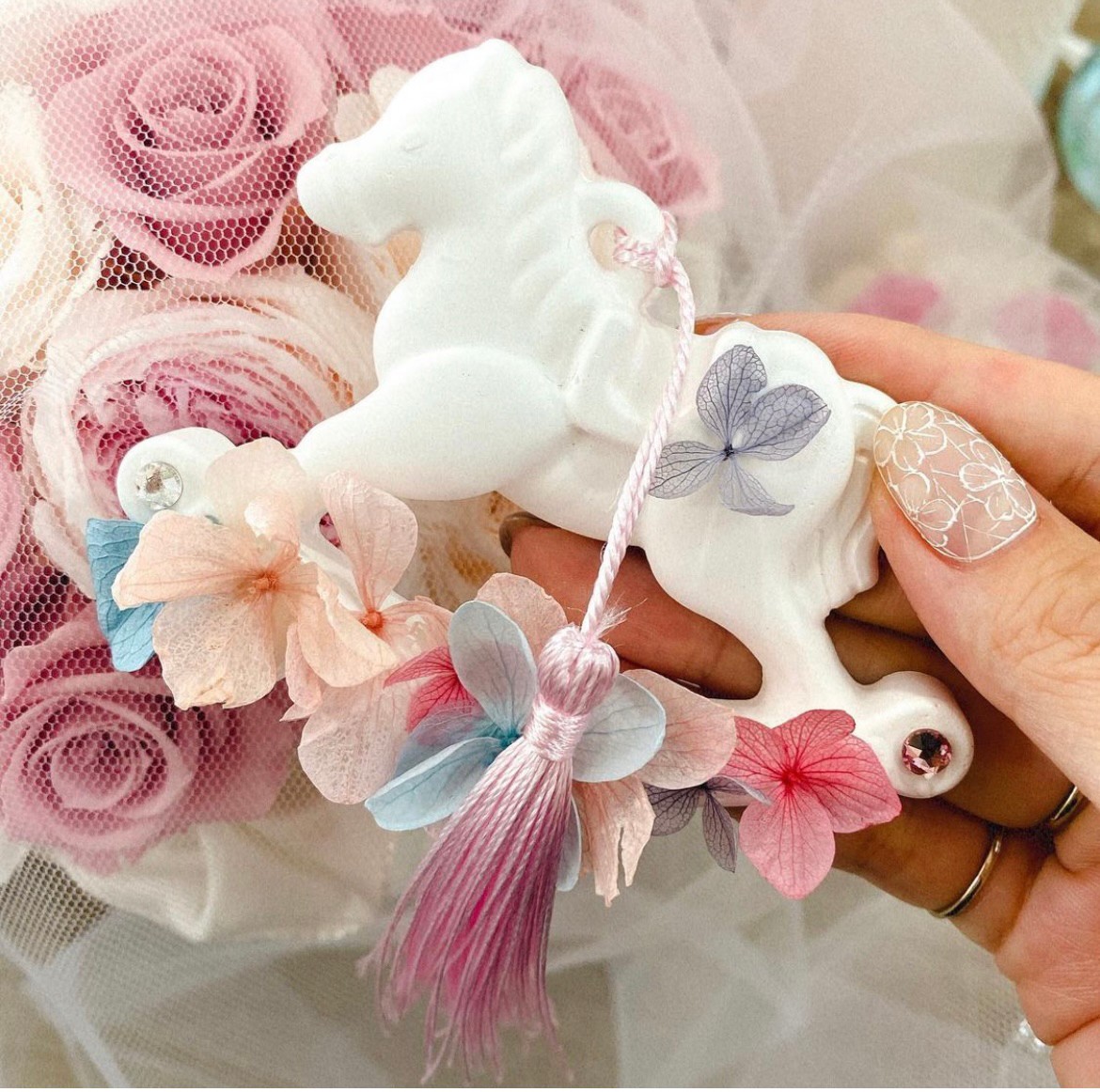 將使用永生花繡球花黏在木馬擴香石上面,再來黏5顆鑽石💎最後挑流蘇的顏色就完成了。非常適合送禮給女朋友,閨蜜,家人喔