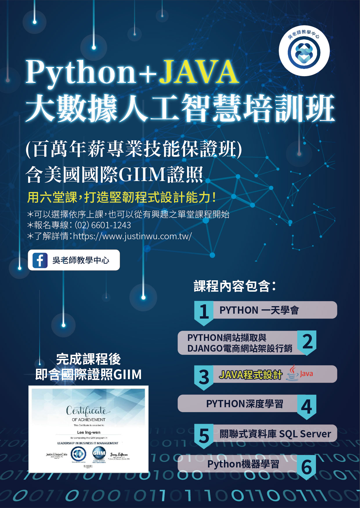課程將採用線上融合實體的課程,隨時無限重看線上課程。週六上課時,再由吳老師親自教導心法,由淺入深,確實瞭解人工智慧大數據的核心觀念與親手實作。
