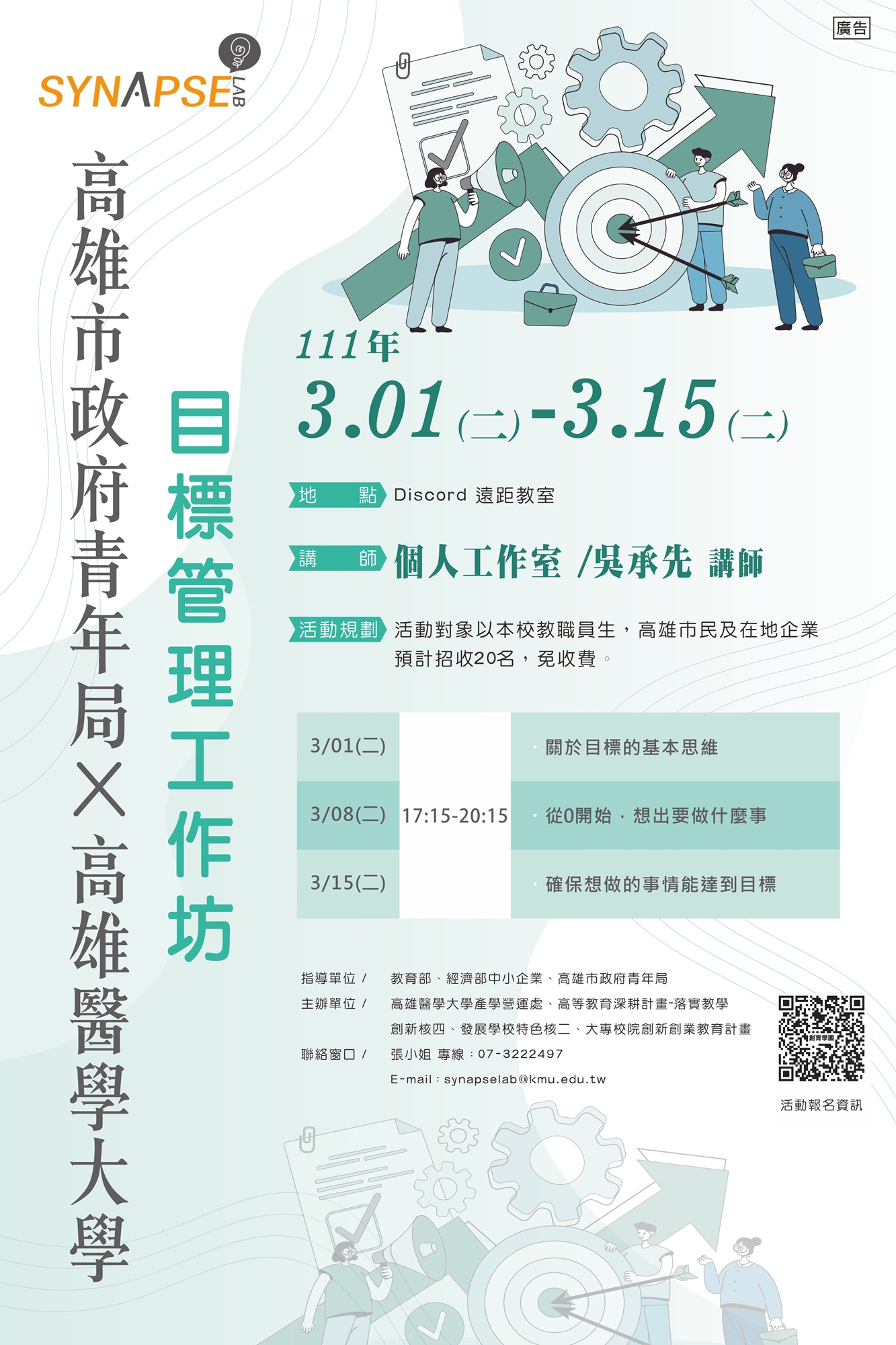 【聯絡窗口】張小姐 專線:07-3222497|單位信箱:synapselab@kmu.edu.tw