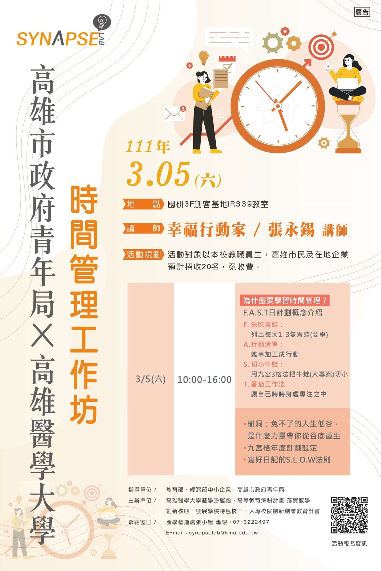 【聯絡窗口】張小姐 專線:07-3222497|單位信箱:synapselab@kmu.edu.tw
