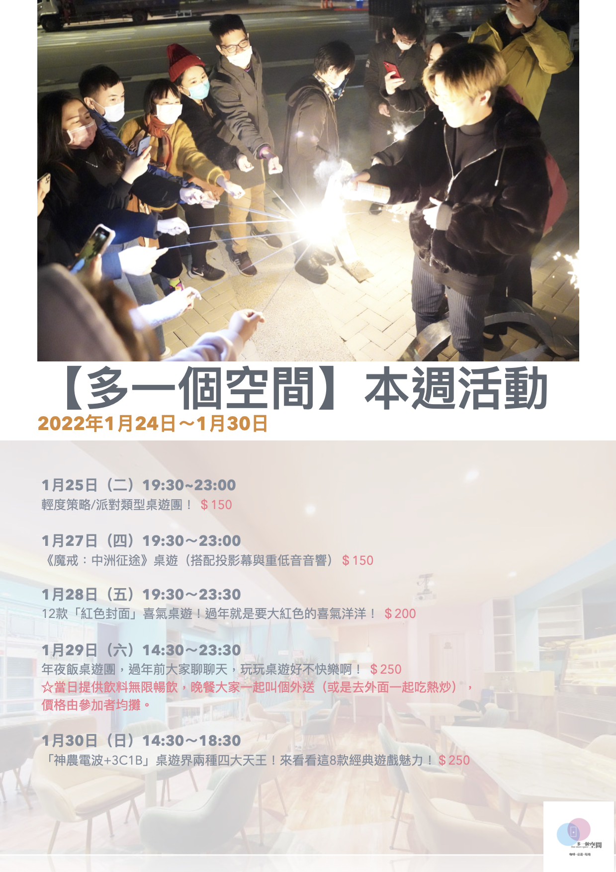「多一個空間」由【多多看電影】的部落客-多多 所創立,一個致力於舉辦各種娛樂活動的場地,是一家複合式桌遊咖啡店,座落於龍山寺捷運站3號出口,視覺裝潢以馬卡龍粉與湖水藍為主要色調,與附近巷弄的古宅呈現極大的跳躍反差。