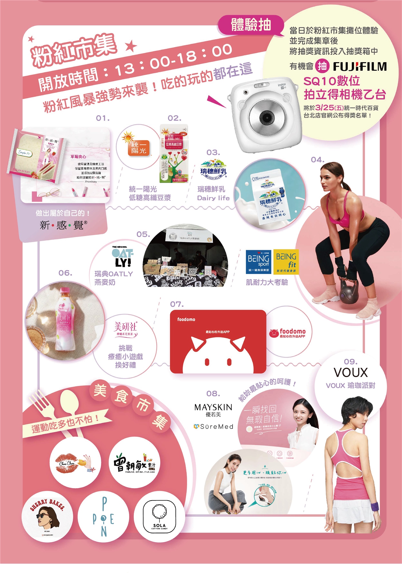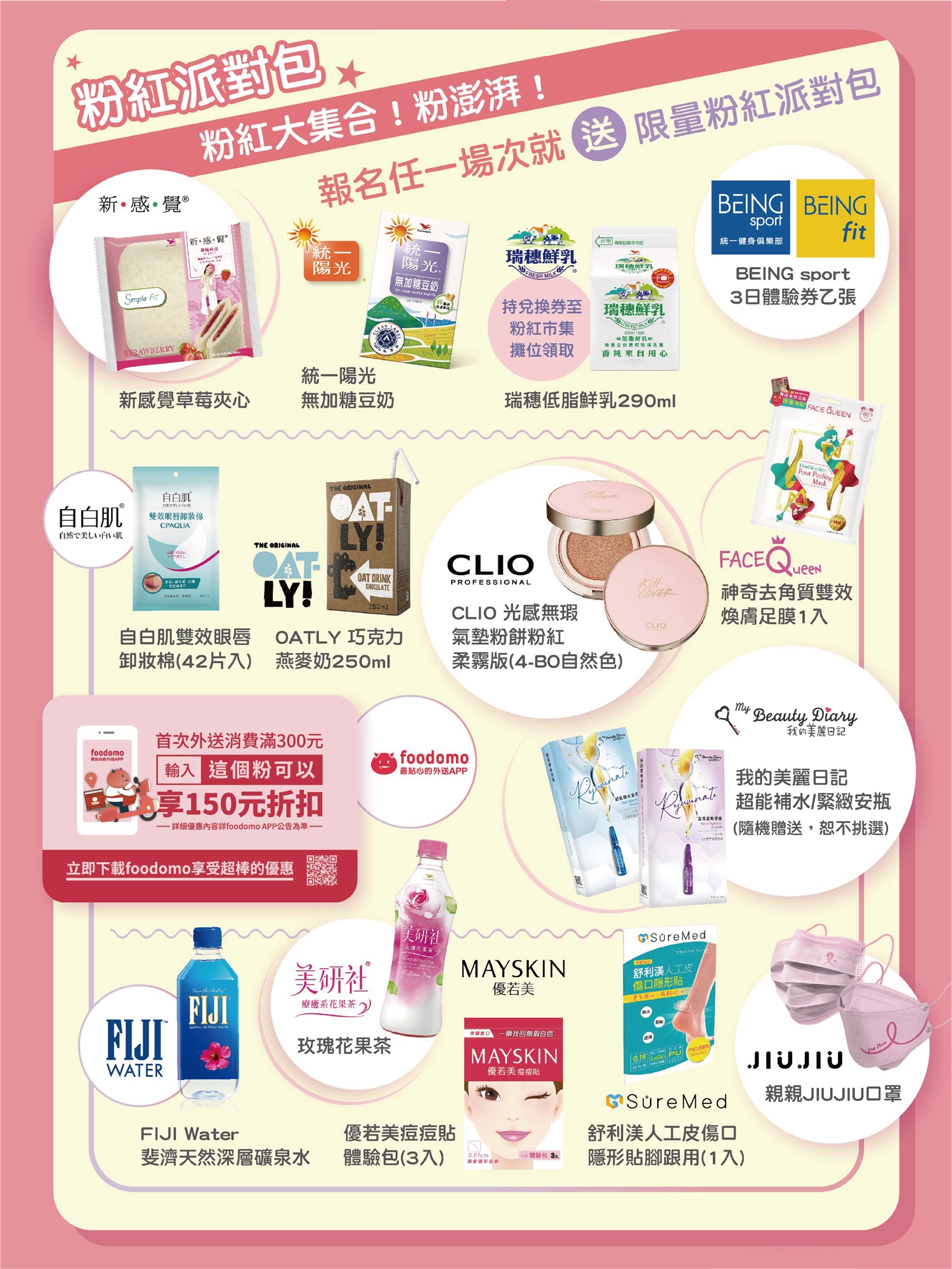 注意事項:1.活動報名自即日起至2022/3/18 19:00截止,逾期恕不受理。 2.參加者(每位)可獲得粉紅派對包一份、以及活動門票一張;3/19粉紅瑜珈場加贈粉紅瑜珈墊一份、粉紅Zumba場加贈粉運動毛巾一份,3/20粉紅瑜珈場加贈粉紅瑜珈墊一份、啞鈴有氧場加贈粉輕量啞鈴一組;以上贈品請於現場點收,離開現場後恕不補贈,贈品亦不得挑款、兌現。3.若因天候或不可抗拒之因素取消本活動,屆時將於3/18 19:00前於統一時代百貨官網公告,恕不另行通知。統一時代APP報名者將於七天內退還點數;Accupass網站報名者本司委託Accupass進行退款事宜,款項將於15個工作天內或次期帳務時間退款,每筆退款完成將寄發簡訊通知消費者,以上退款流程統一時代百貨台北店將保有最終決定權。4.圖片皆為形象參考,以現場實物為準。5.參與者須遵守各項活動規定,統一時代百貨台北店保有活動變更、休止或終止權力。6.獎品限由中獎人本人兌換使用(18歲以下中獎者須提供監護人同意書),同行人則不具資格不得代領,本獎品不得轉讓或折現。7.依中華民國稅法規定,獎品價值超過1,001元(含)以上,須負擔贈品價值之10%稅金,非中華民國境內居住之個人(即在中華民國境內未達183天之本國人及外國人),不論得獎人所得之金額,須負擔贈品價值之20%稅金,並由統一時代百貨台北店代收並於年度開立扣繳憑單。8.現場服務攤位服務僅提供至18:30,活動結束後不提供服務。9.若有其他未盡事宜。以現場活動公告為主。10.凡完成報名手續後,若因故無法參加,報名費及點數不另行歸還,視同棄權。