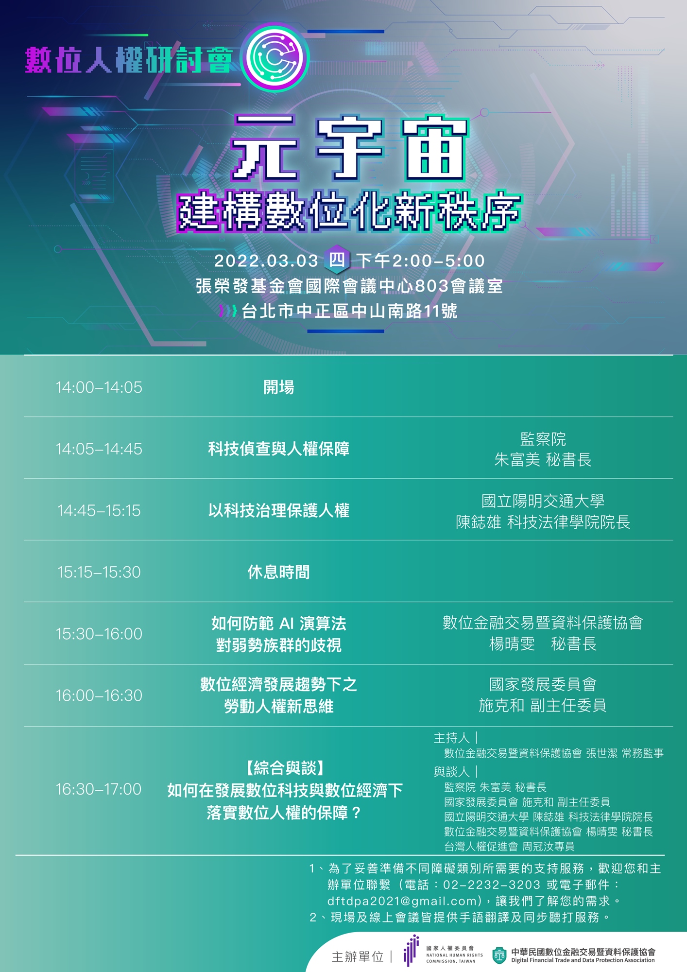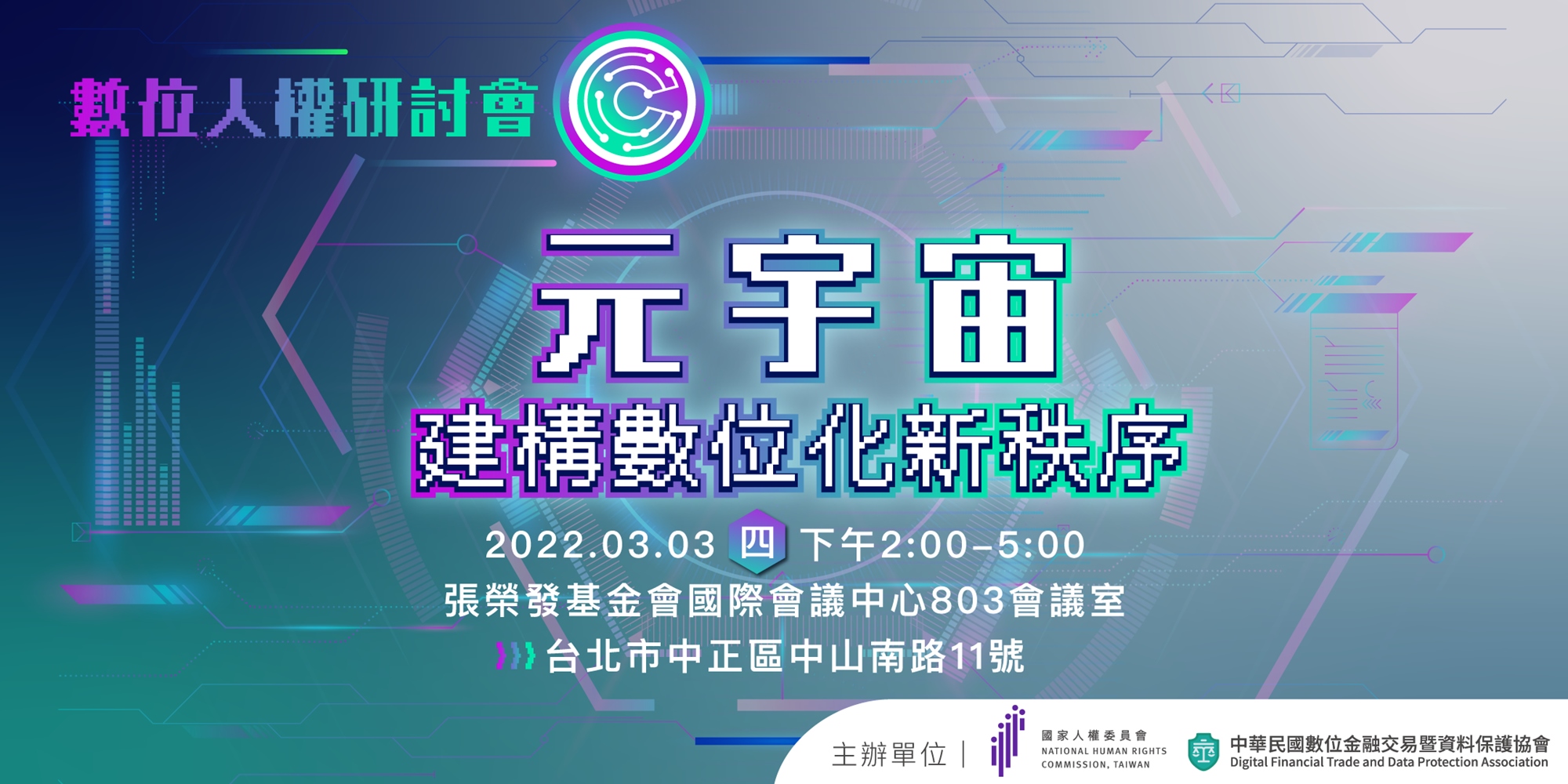 為推廣數位人權觀念,國家人權委員會與中華民國數位金融交易暨資料保護協會將共同舉辦四場《數位人權研討會》,邀請各界學者及實務工作者分享多元跨領域觀點,結合各方專業知識及實際經驗,共同探討在高度數位化的時代,如何藉由科技面對多元變化形態、數位未來之際。