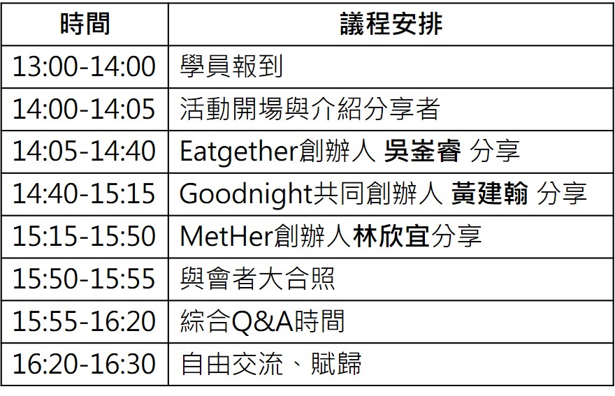 聯絡窗口:Taiwan Startup Hub 新創基地 童先生 (02) 2772-8802#13