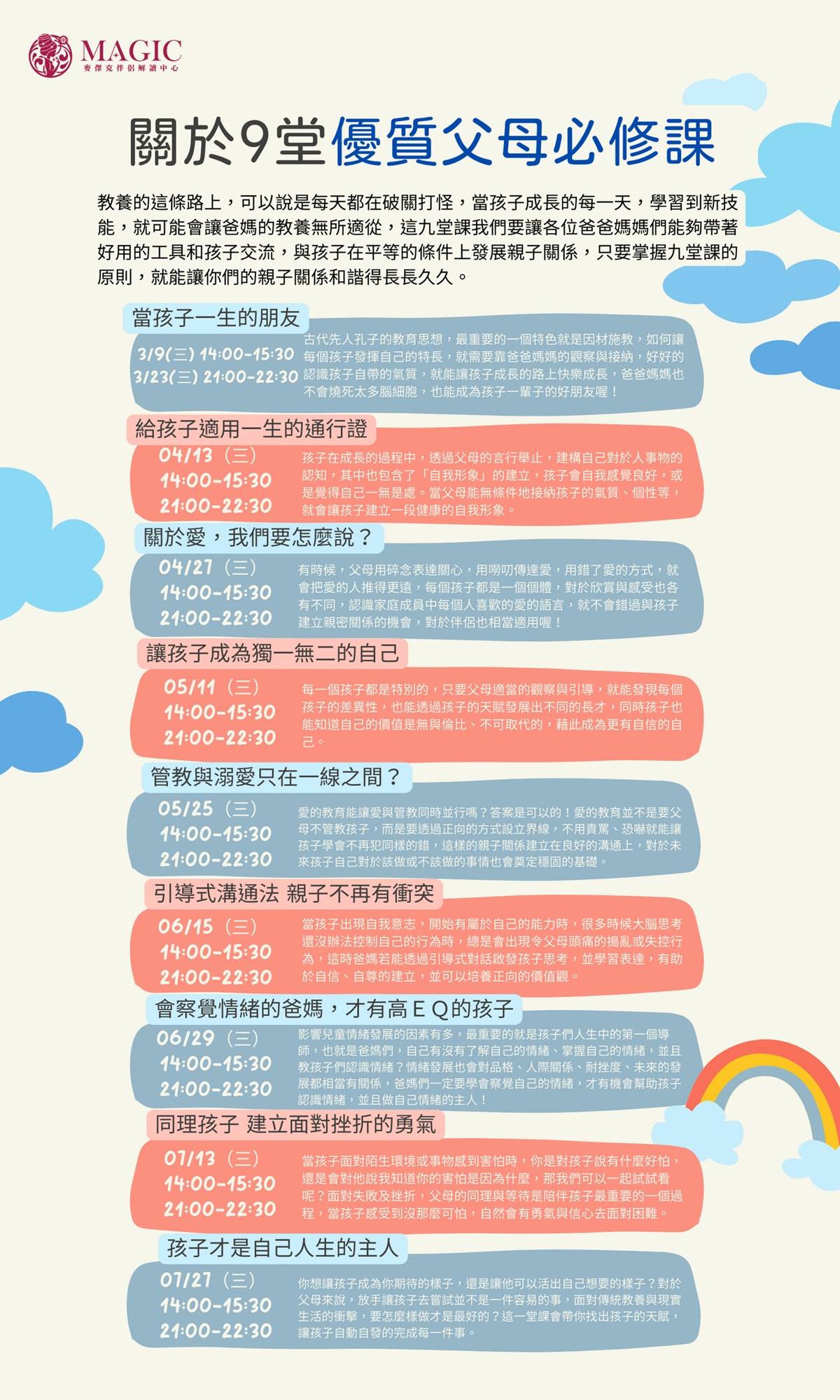 7.若購買九堂課程者,有單堂課程錯過正式上課時間,本中心提供該課程影片回放,觀看權限一個月,如有疑問請洽麥傑克伴侶解讀中心客服(https://bit.ly/34oRPID)