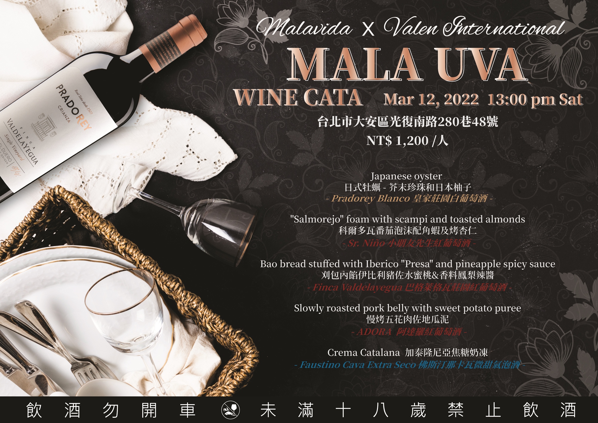 活動時間將會在3/12中午1:00舉行,每位貴賓只需$1200,即可享用經典的美酒,以及主廚特別準備的應景料理。