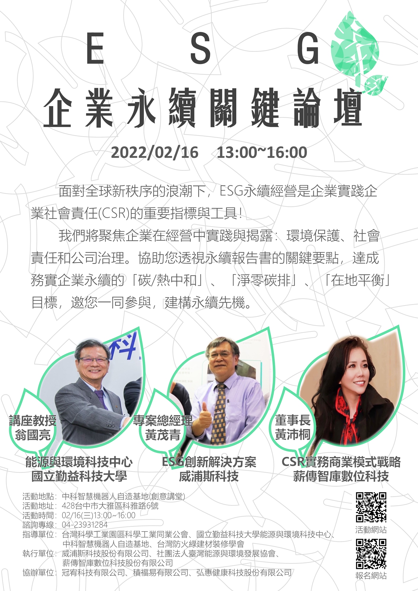 我們將聚焦企業在經營中實踐與揭露:環境保護、社會責任和公司治理。協助您透視永續的關鍵目標、行動、策略與撰寫要點,達成務實企業永續的「碳/熱中和」、「淨零碳排」、「在地平衡」目標,邀您一同參與,建構永續先機。