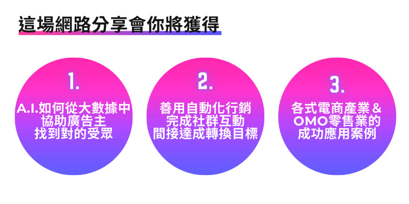 這場論壇你將知道A.I.如何從大數據中,協助廣告主找到對的受眾,並運用會員經營,累積數據以便更了解消費者,以有效率的方式優化廣告,搭配實際電商成功案例分享,協助品牌行銷更智慧,突圍疫情困境,發現新商機。