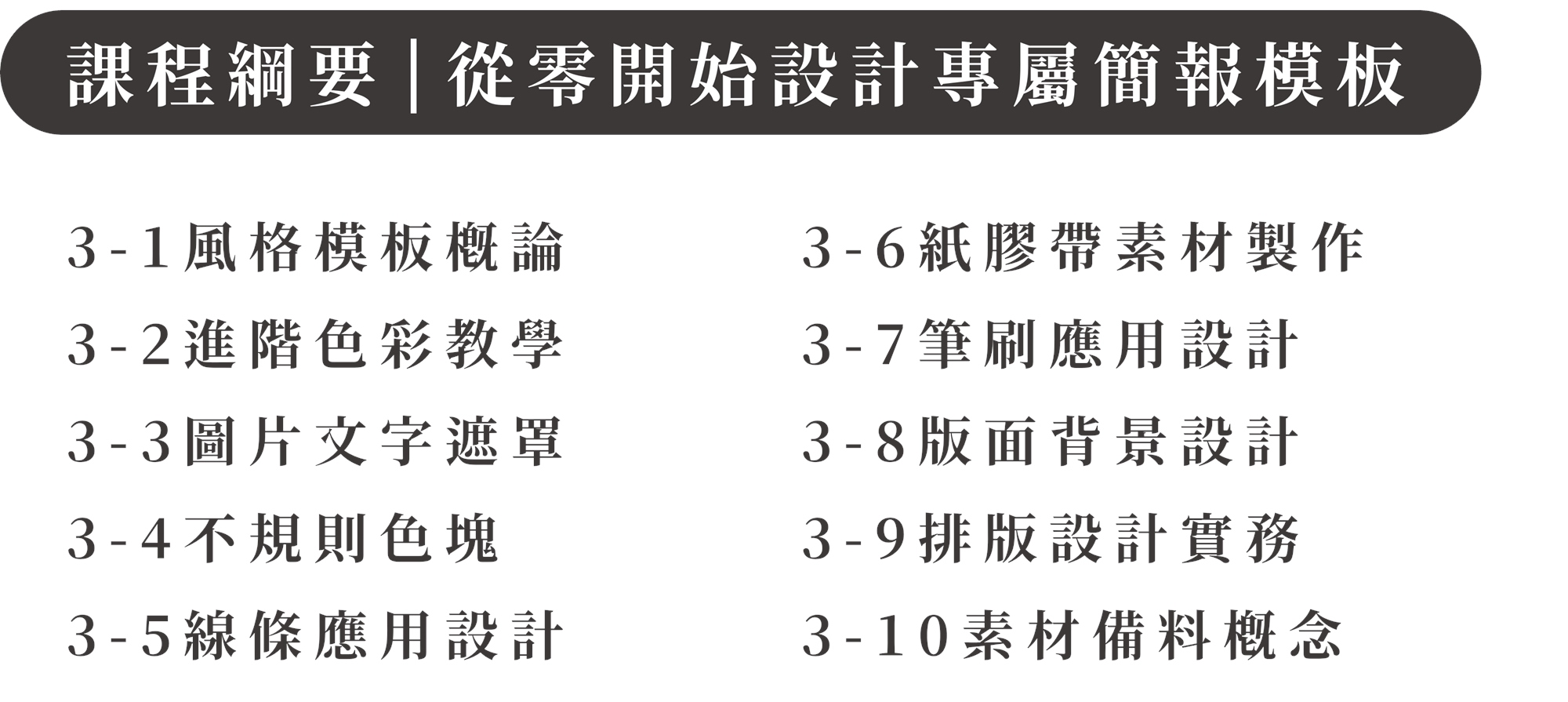 介紹各種簡報排版設計手法及簡報模板應用及風格概念,幫助學員做出專屬風格的簡報模板。