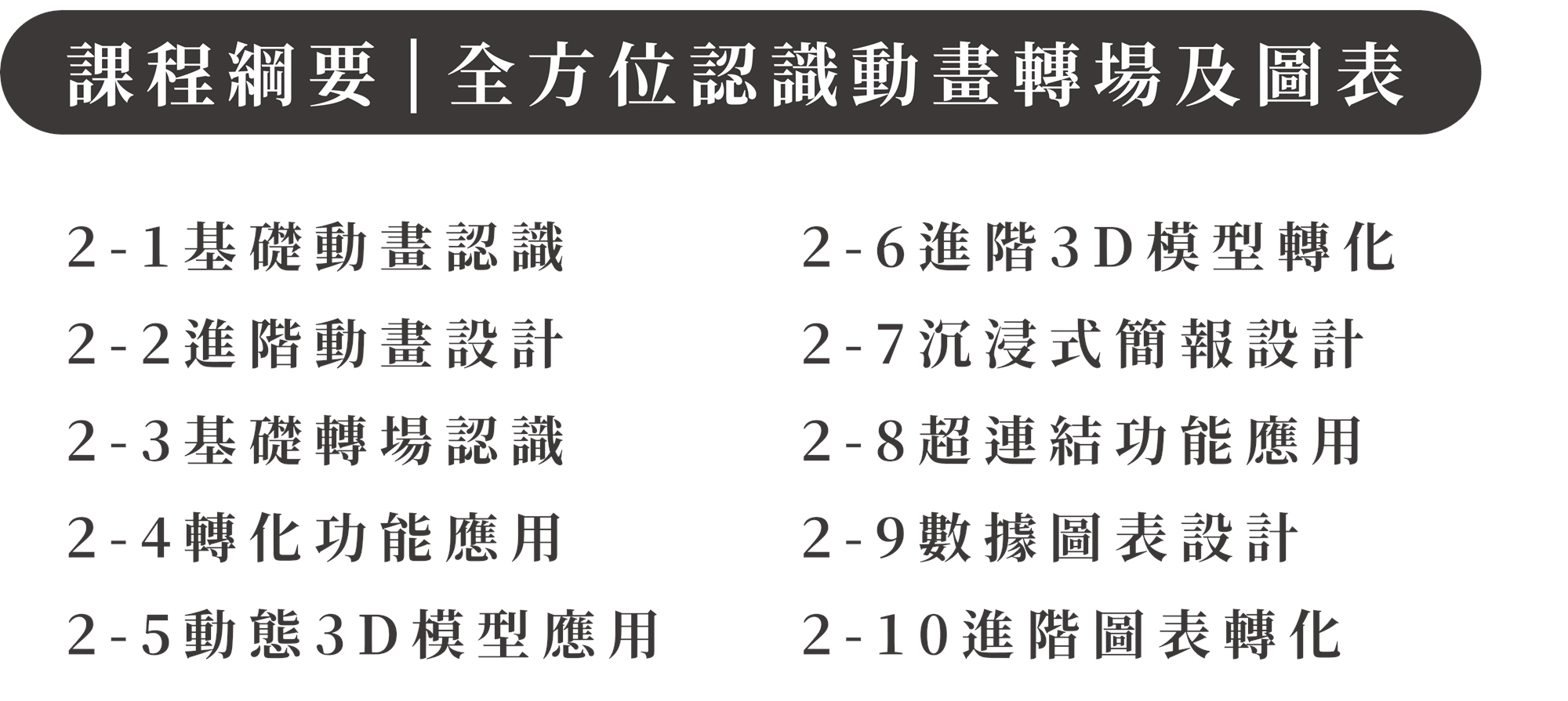 介紹動畫轉場概念及實際應用方式、各類圖表呈現方式以及超連結功能應用實務設計各種生動的簡報設計。