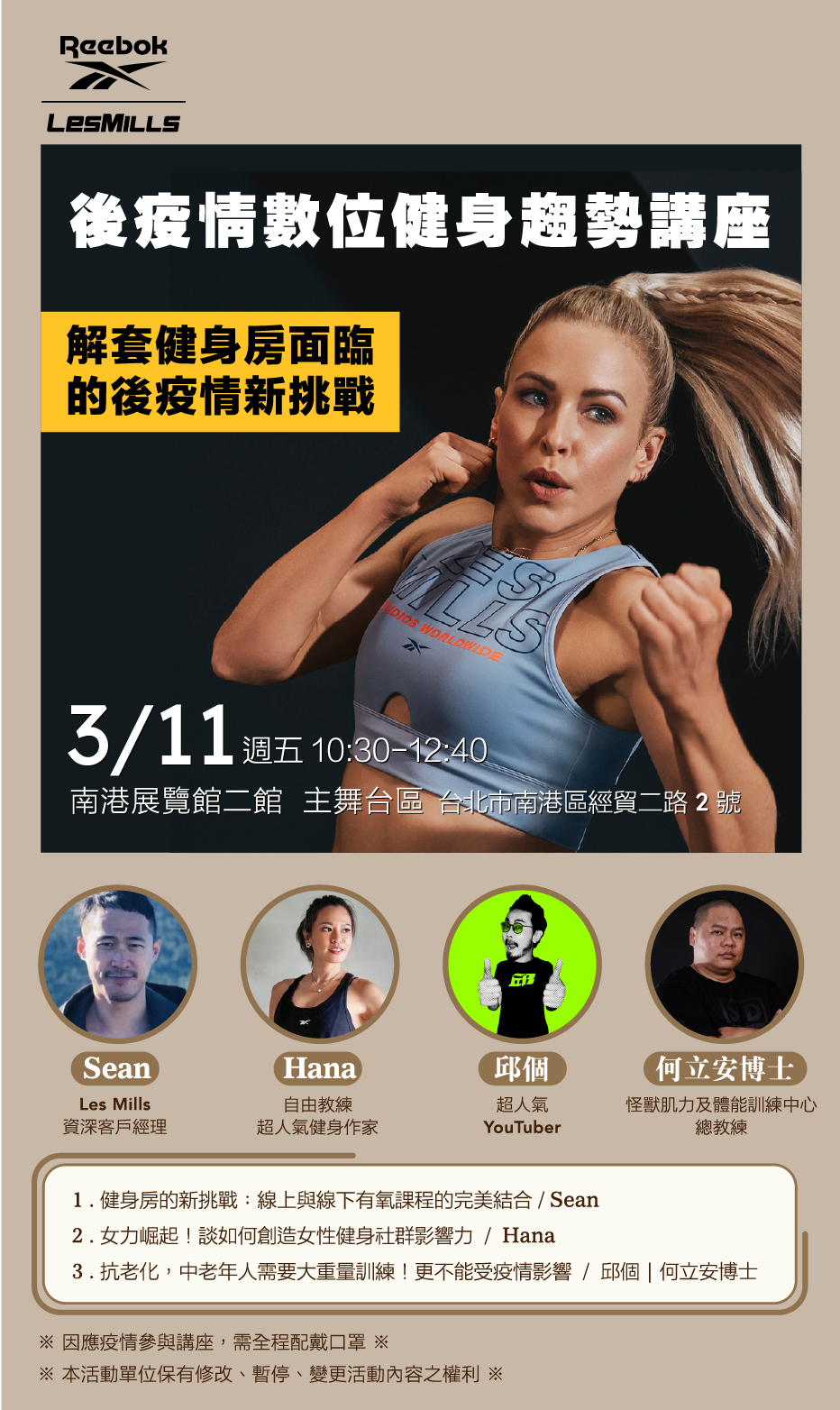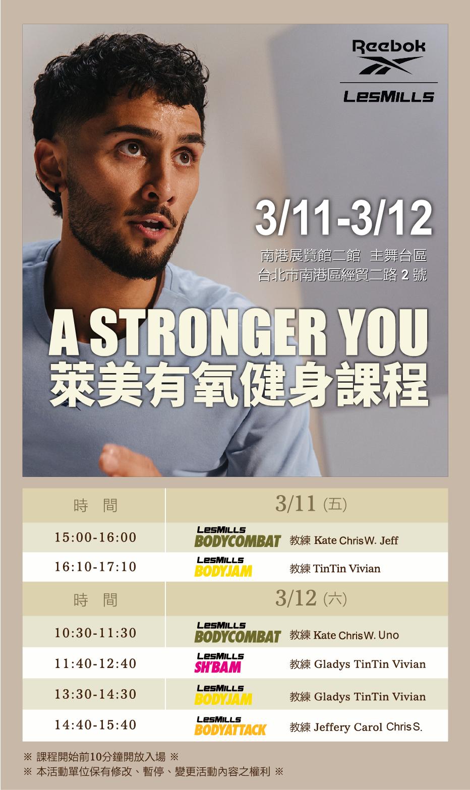 ▲參加運動課程的來賓,請務必自行攜帶水、毛巾及穿著運動服及運動鞋,未攜帶者為安全考量工作人員將有權拒絕您的進場。