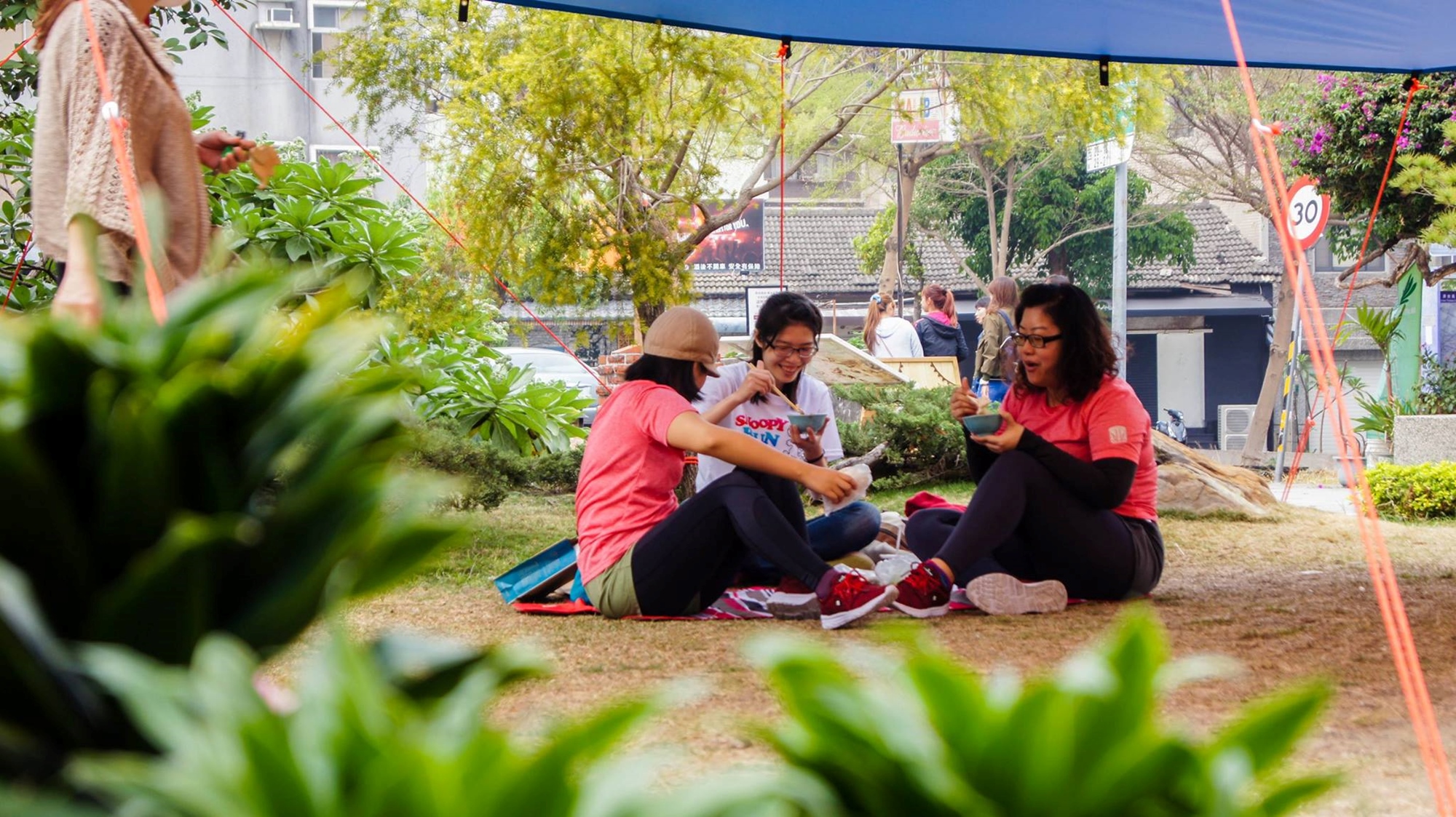 坐在綠草皮上開心聊天、吃美食、玩手作、逛市集,