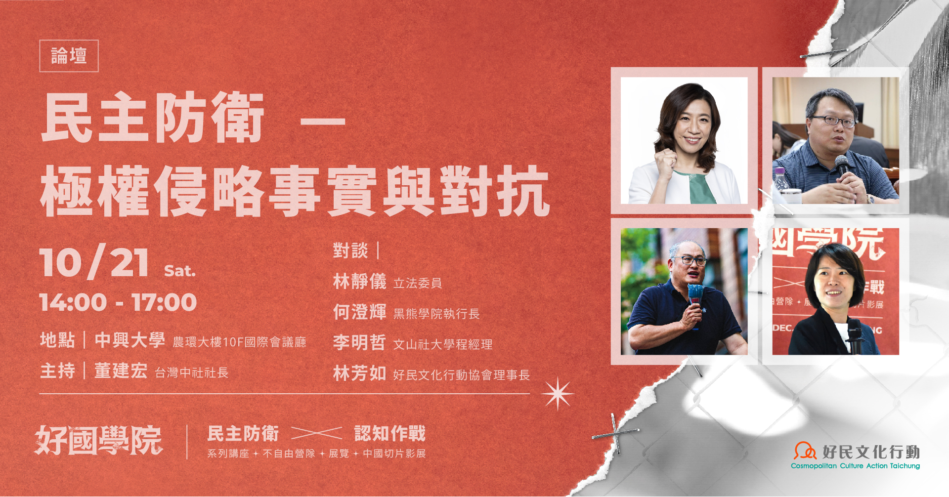 本論壇邀請黑熊學院執行長何澄輝,黑熊學院舉辦許多民防課程,不僅包含基礎課如戰爭基本知識、資訊戰與認知作戰,更有許多進階課程,培養不同的民防人材。也邀請到文山社大學程經理李明哲,曾因聲援人權而遭中國關押五年,如今平安回到台灣仍持續發聲。以及好民文化行動協會理事長林芳如,大家將各自提出關於中國極權侵略的分析,並分享身為台灣人的我們要如何因應、對抗。誠摯邀請大家參與論壇,加入討論。