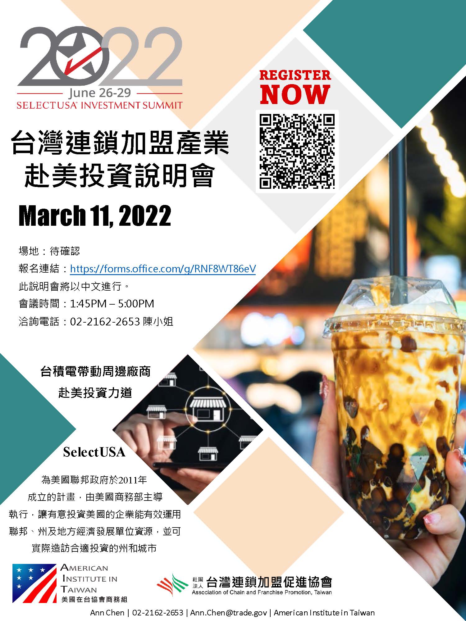 美國在臺協會(AIT)商務組與台灣連鎖加盟促進協會合作辦理「2022台灣連鎖赴美投資說明會」~~難得機會,歡迎會員朋友趕快來報名!!