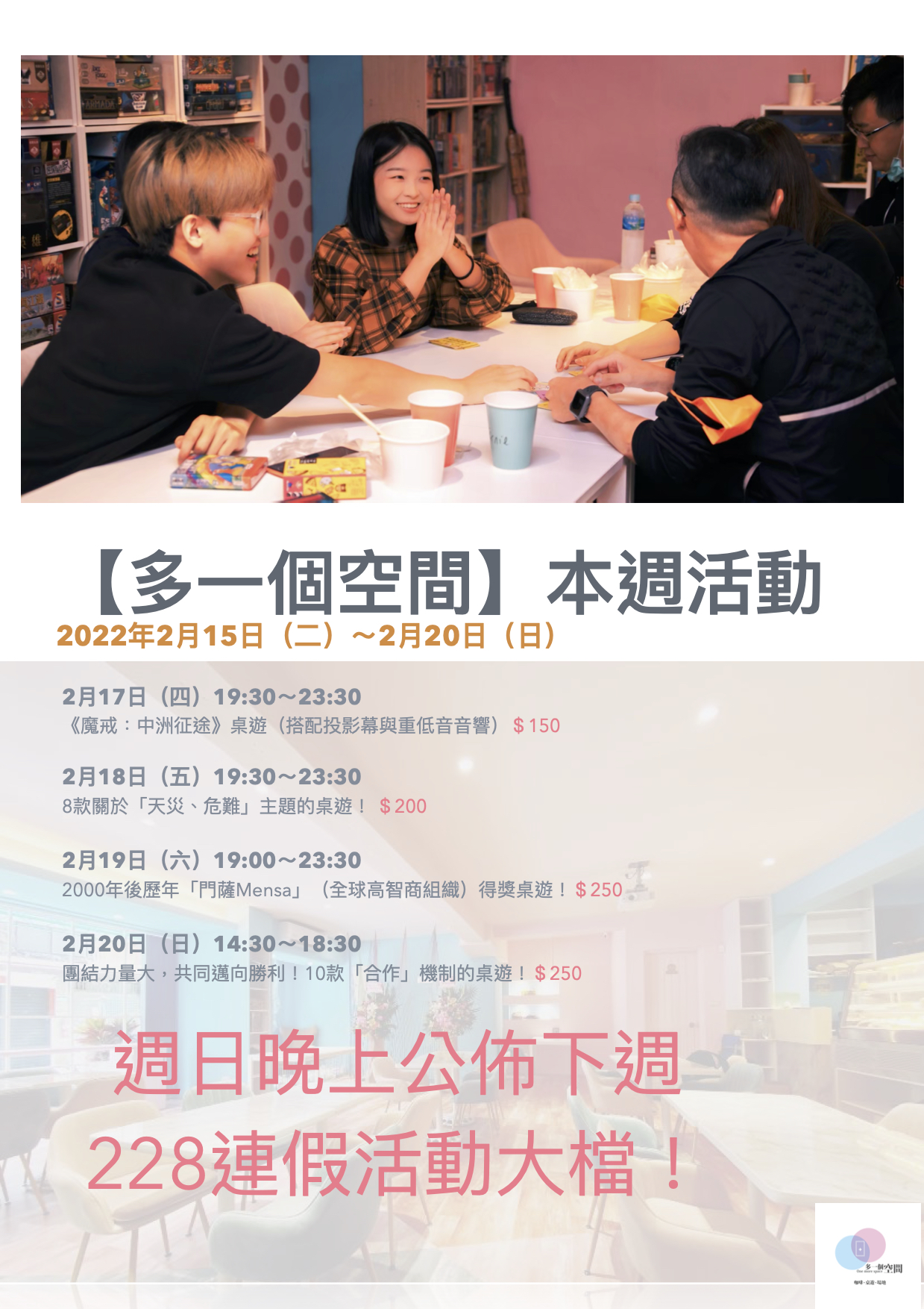 「多一個空間」由【多多看電影】的部落客-多多 所創立,一個致力於舉辦各種娛樂活動的場地,是一家複合式桌遊咖啡店,座落於龍山寺捷運站3號出口,視覺裝潢以馬卡龍粉與湖水藍為主要色調,與附近巷弄的古宅呈現極大的跳躍反差。