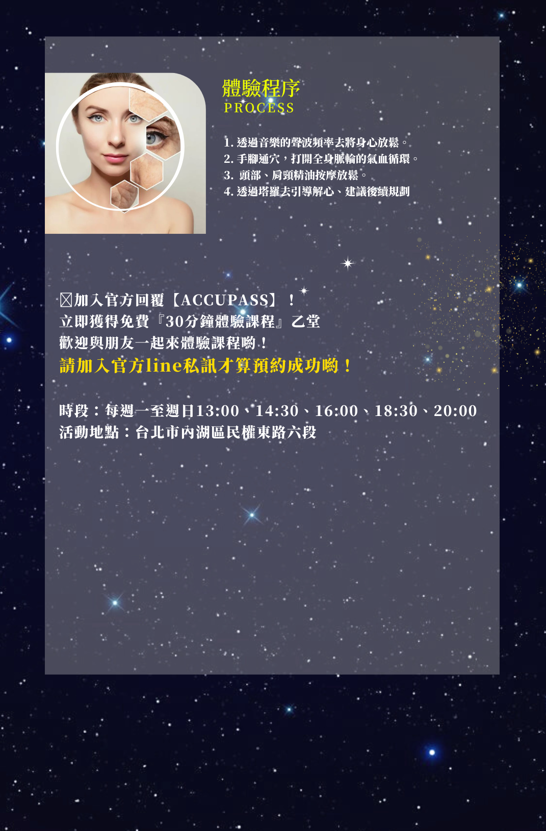 ⚜️ 活動報名方式👉加入官方line@ 回傳「ACCUPASS靈魂美容」即可免費獲得體驗乙次‼️