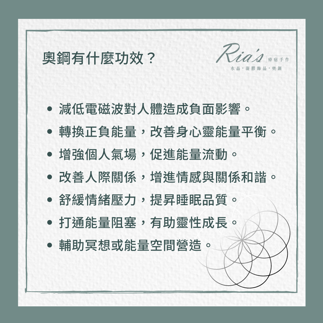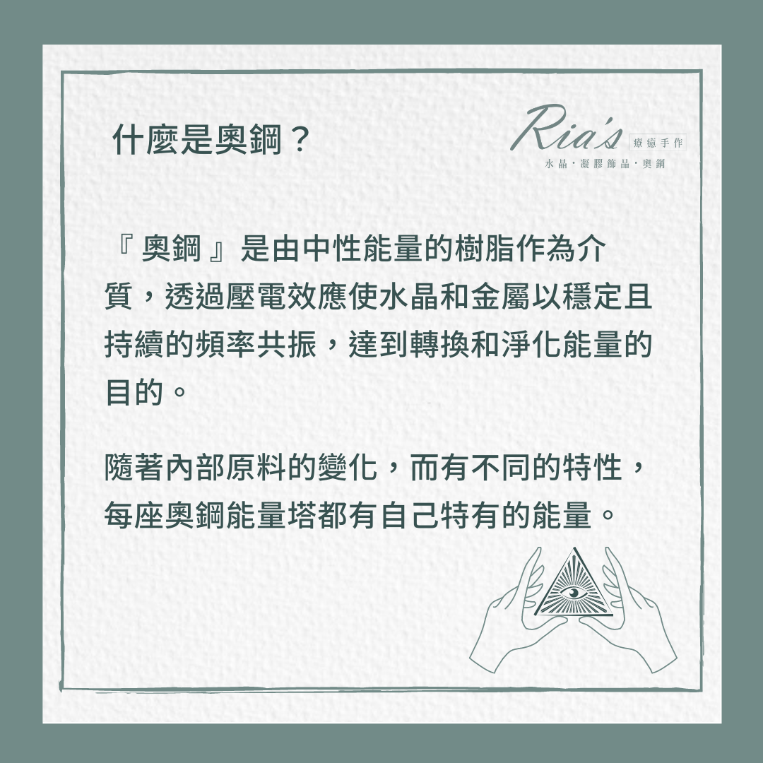 每座奧鋼能量塔隨著內容物的組合和設計編排而不同的特性,就像每個人的外貌/個性,各自有特定的主題和能量。可以與主人的祈願結合,也可以配合家居設計作為空間的裝飾元素。