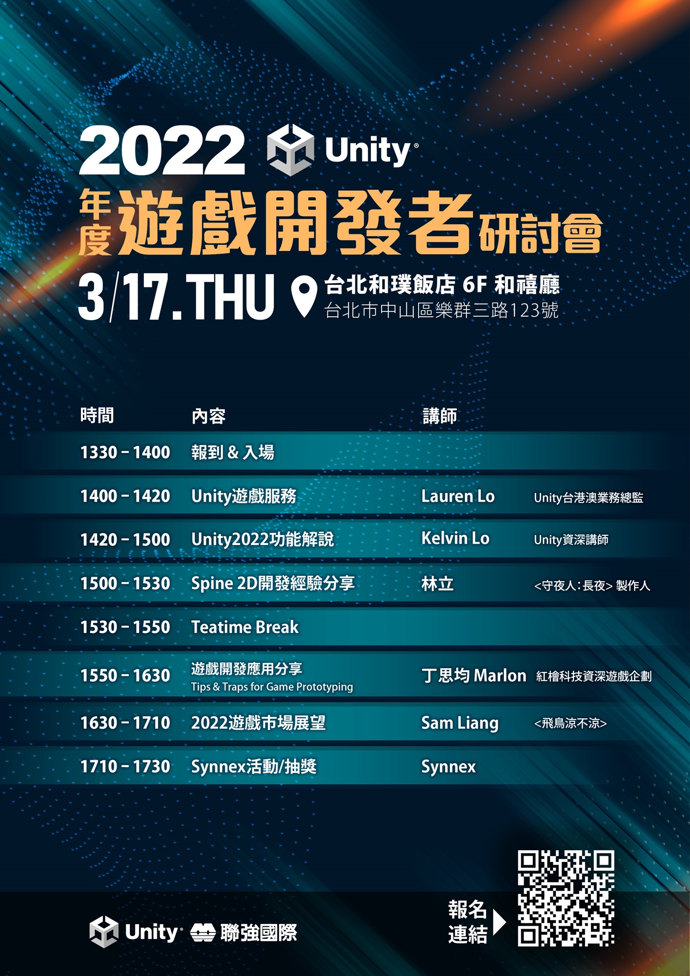 由Unity與台灣代理商 聯強國際 主辦的遊戲開發者論壇研討會,將在本次活動內帶來Unity能給予所有開發者的應用發展以及2022最新功能的分享!與會中也邀請開發領域中的合作廠商,帶來相關實務分享。