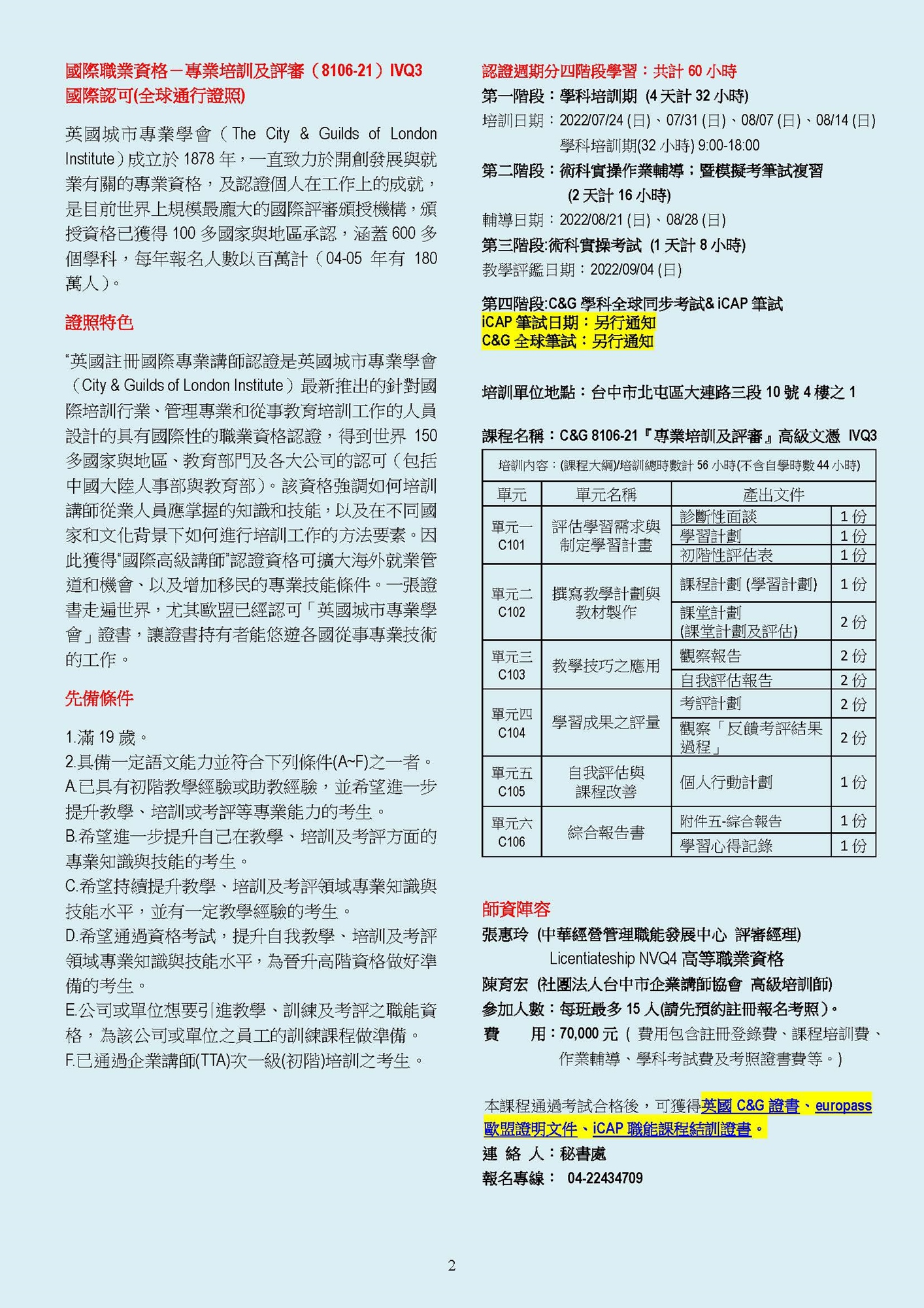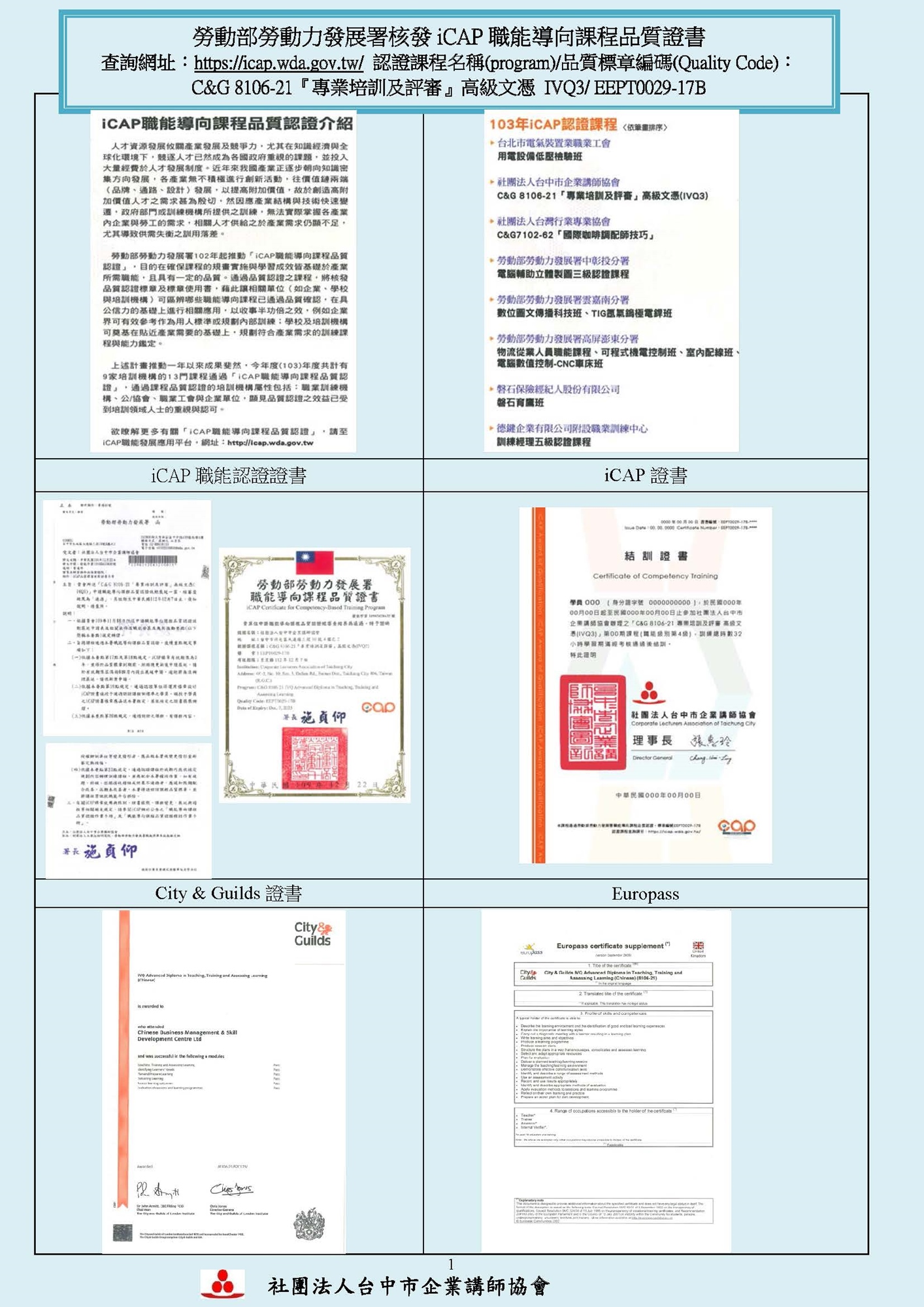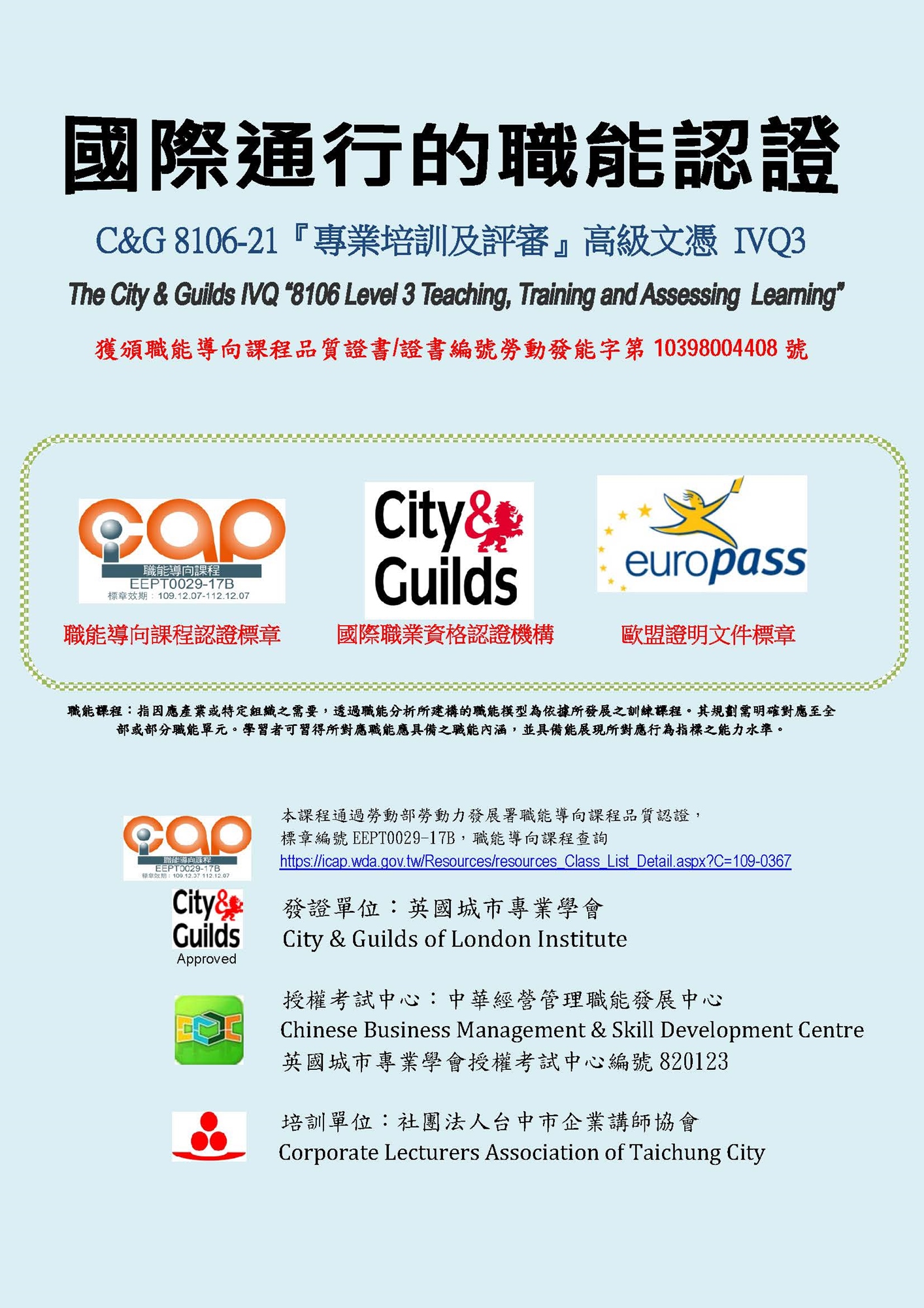 國際職業資格 8106-21「專業培訓與評審」等級3 提供下列關於教學、培訓與技能評量的基礎知識與實務: