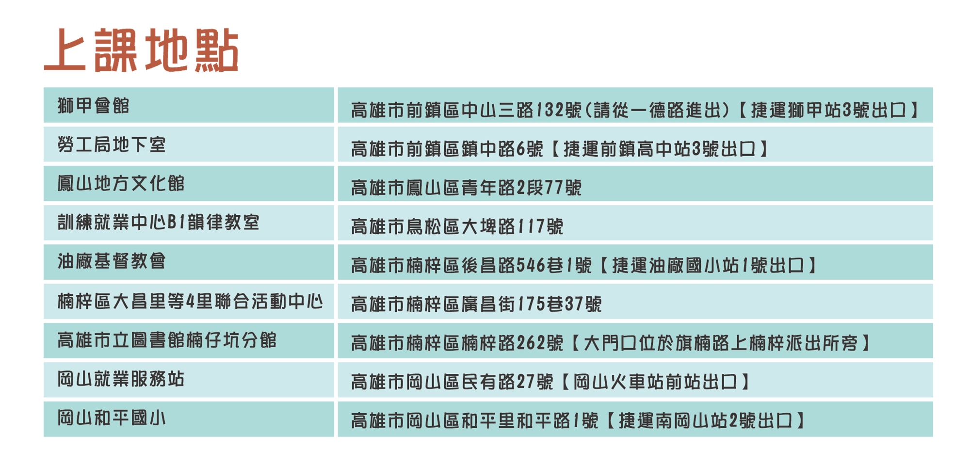 4.開課條件:每門課程報名人數須達10人始開班,因人數不足致無法開課之班別及退費事宜,於開課前一週公告於勞工大學網站「最新消息」(http://college.kcg.gov.tw/)。