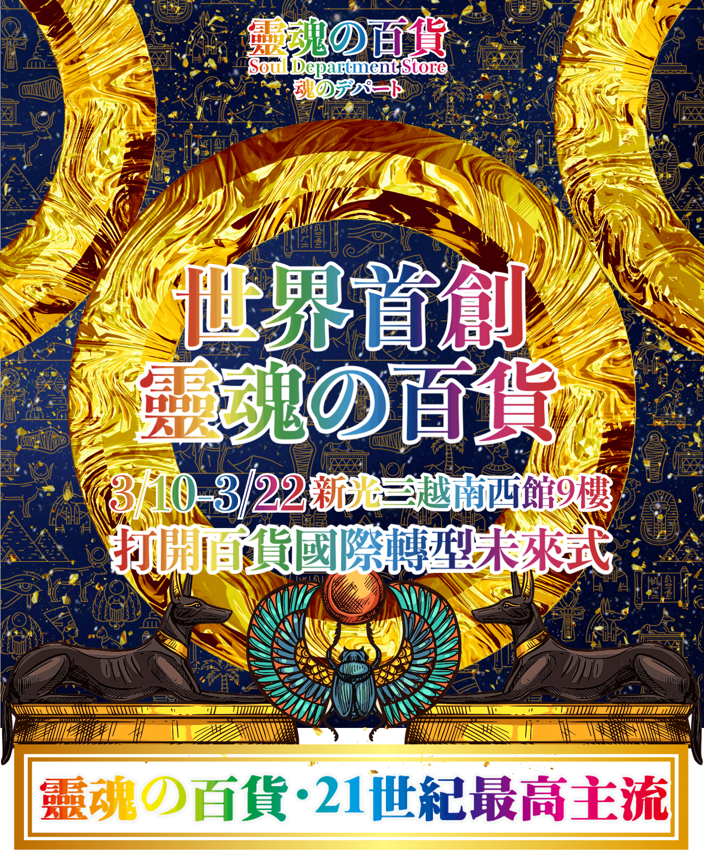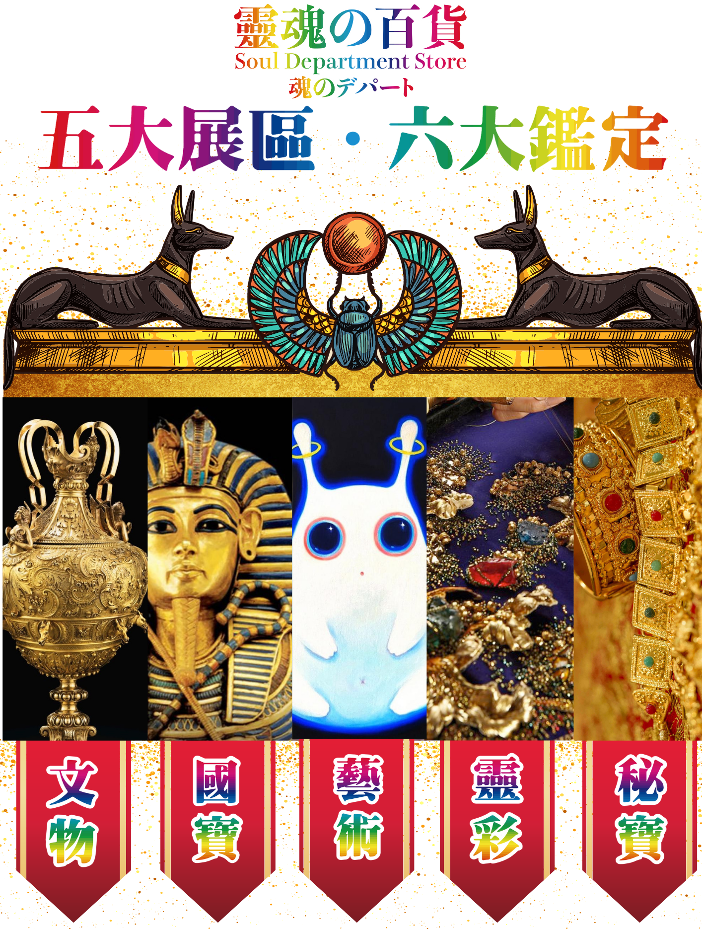 當時的古埃及人相信靈魂是永恆不滅的,人有來世來生也有前世今生!法老與埃及艷后,為靈魂準備各式各樣的寶物,不只可以在另一個次元中使用,更能讓靈魂擁有富貴極樂!這就是《靈魂の百貨》的起源!