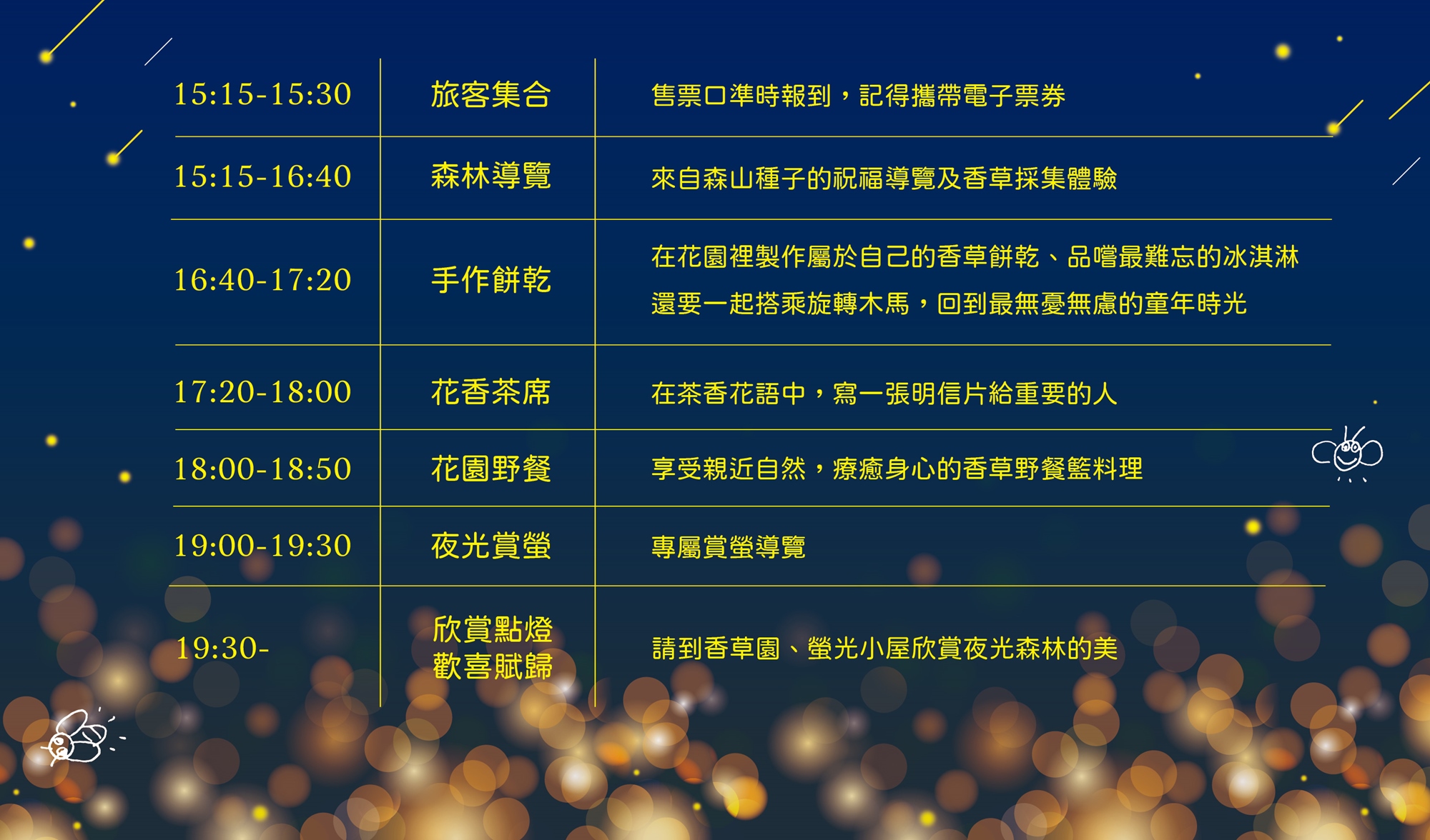 ※由於螢火蟲每年出沒日期時間不一定,一切行程視當天天氣與狀況修正